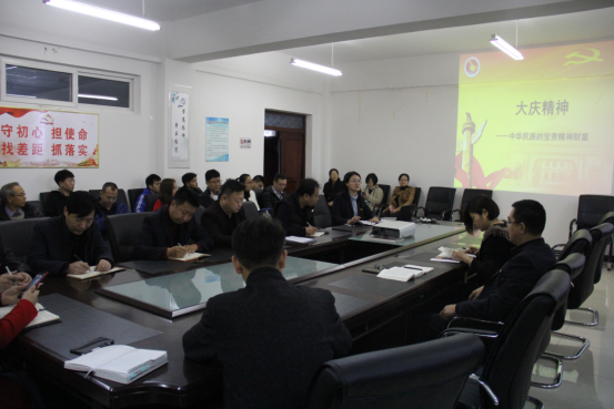 按照学校党委《关于开展“不忘初心、牢记使命”主题教育的实施方案》的部署,结合学院党委《关于开展“不忘初心、牢记使命”主题教育的实施方案》的要求,10月30日下午,我院院长郭媛为师生党员上了一堂“大庆精神——中华民族的宝贵精神财富”专题党课。学院领导班子成员、教师党员和部分学生党员参加了党课。