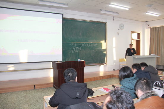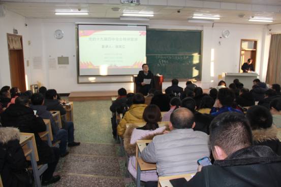 为深入学习贯彻党的十九届四中全会精神,落实中央关于坚持和完善中国特色社会主义制度、推进国家治理体系和治理能力现代化的重大决策部署,在全校掀起学习宣传党的十九届四中全会精神的热潮。按照学校党委宣传部下发的《关于开展党的十九届四中全会精神宣讲的通知》要求,12月11日下午,学校办公室副主任、副教授徐凤江为材料科学与工程学院、通信与电子工程学院、计算机与控制工程学院师生党员作了题为《牢固树立制度意识、推进国家治理体系和治理能力现代化》的主题宣讲。学院领导班子成员、教师党员及部分学生党员参加了宣讲,宣讲由我院党委书记陈志强主持。