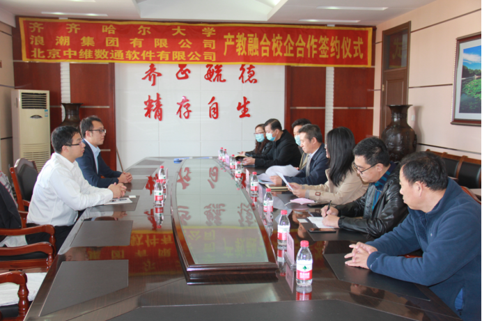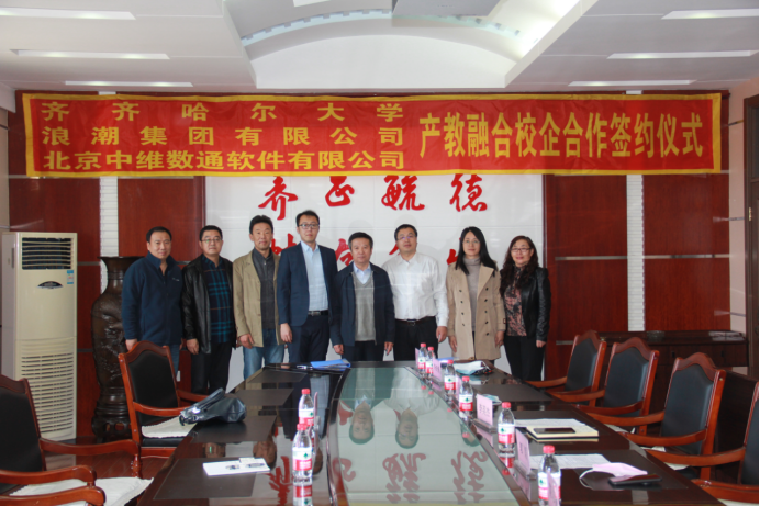 为了深化产教融合、校企合作,促进校企之间的沟通交流,10月5日下午,我校与浪潮集团有限公司、北京中维数通软件有限公司在机关楼504举行产教融合校企合作签约仪式。我校副校长李英杰、招生就业处处长杨国志、教务处处长李奇楠、副处长李莉、计算机与控制工程学院党委书记陈志强、院长郭媛、副院长魏连锁出席了签约仪式。浪潮集团有限公司总经理吴鑫、北京中维数通软件有限公司总经理、我校96届优秀校友魏洪春共同参加了签约仪式。签约仪式由郭媛主持。