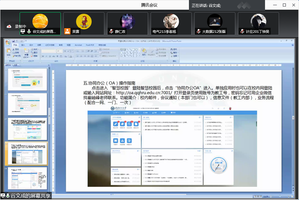 培训会上,谷文成详细讲解了协同办公、智慧校园、大学邮箱、WebVPN等系统的基本操作以及工作中常见问题的解决方法,并对智慧校园系统中常用的校园信息平台、OA协同办公、图书管理、校园邮箱、网上办事流程等进行了介绍和演示。
