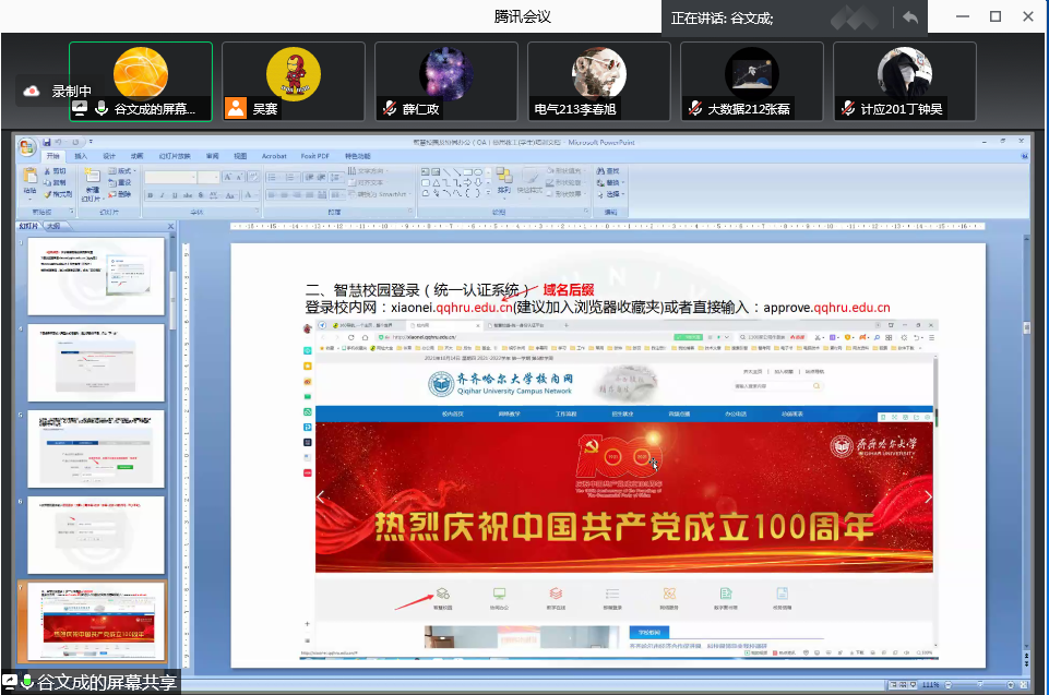 为进一步深化“放管服”改革,深入落实党史学习教育“我为群众办实事”工作部署,加快建设服务型学校,落实学校关于“一网、一门、一次”的改革要求,推进校园信息化建设。11月24日下午,网络信息中心谷文成老师应邀为我院师生做关于在校内使用智慧校园邮箱、协同办公、统一认证平台、各种应用平台等方面培训。学院党委委员、各党支部书记在会议室参加线下培训,其他教职工及各班班长、学习委员采用腾讯会议的方式在线上参加培训,培训会由学院党委书记陈志强主持。