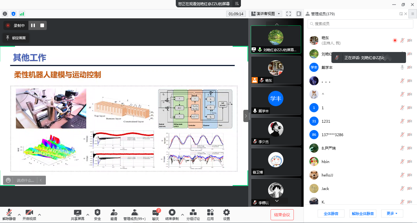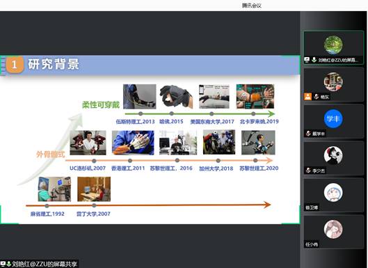 刘艳红教授从研究背景、团队介绍、研究工作三个方面对报告主题进行了论述。她简要介绍了可穿戴上肢康复机器人感知与控制技术发展的研究背景,举例论证了机器人感知与控制技术的重要性,并通过图文分析详细介绍了多种康复机器人的用途和相关控制过程。然后,刘艳红教授介绍了自己所在的国际化团队-河南省高校科技创新团队,并具体介绍了该创新团队的三个研究平台及相关研究工作。