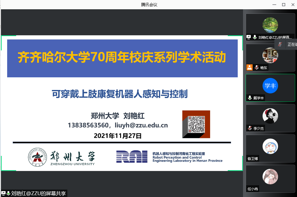 11月27日上午,我院邀请郑州大学刘艳红教授为我校师生作题为《可穿戴上肢康复机器人感知与控制》的学术报告。报告会由控制科学与工程一级学科带头人戴学丰教授主持,相关领域的教师和学生共计400余人次,以线上的形式参与了本次学术报告。