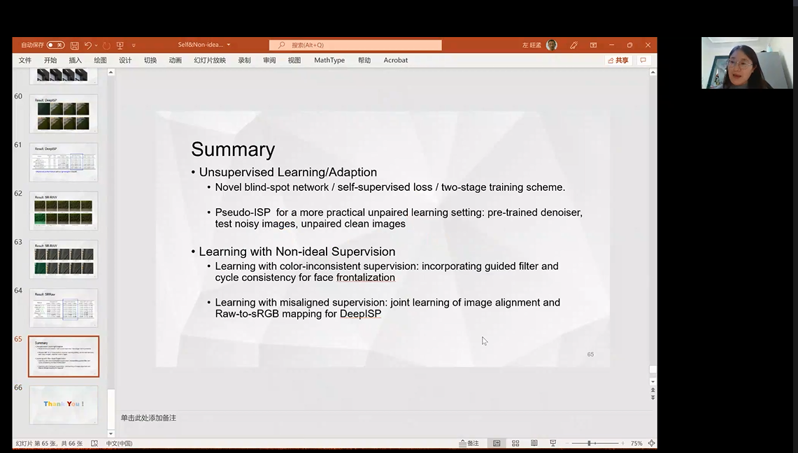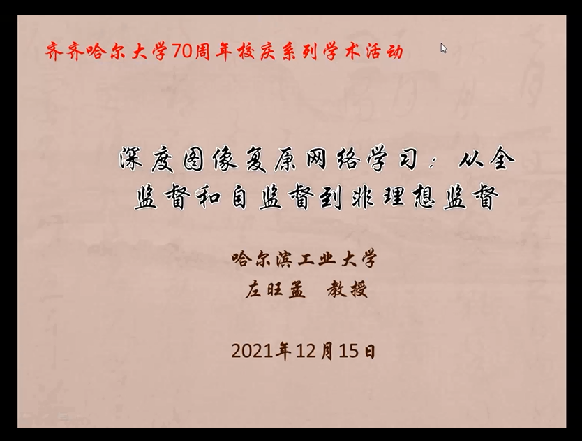 左旺孟教授从深度图像复原网络、自监督学习及非理想监督学习三个方面对报告主题进行了论述。他简要介绍了自己所在的科技创新团队,并具体介绍了该团队在图像降噪、复原等方面在世界该领域所处的位置。然后介绍深度图像复原网络学习的研究背景,举例论证图像复原技术的重要性,并通过图文分析详细介绍了全监督、自监督和非理想监督的原理与区别。