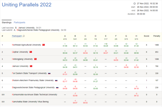11月26日,第十五届中国黑龙江及俄罗斯远东地区大学生计算机竞赛成功举行。本次竞赛由中俄大学生数学、计算机竞赛组委会主办,佳木斯大学承办。采用线上线下相结合的方式,来自俄罗斯的阿列赫姆国立大学、布拉戈维申斯克国立师范大学、远东国立交通大学、共青城国立技术大学、勘察加国立大学、勘察加国立技术大学与来自中国的东北农业大学、黑龙江大学、佳木斯大学、齐齐哈尔大学等共计10所高校的57名中俄大学生线上参赛。