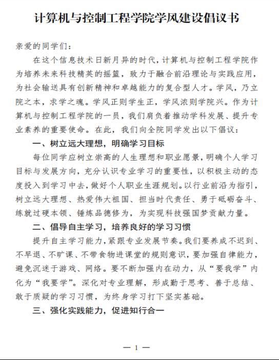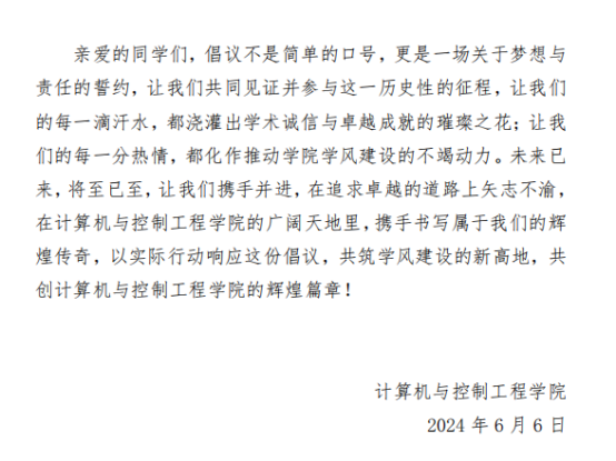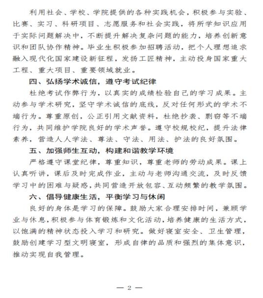“十个一”专项行动的开展,标志着我院在提升教育质量和促进学生全面发展方面迈出了坚实的一步,受到了师生们的广泛好评和积极响应。随着“十个一”专项行动的深入实施和学风倡议书的广泛传播,我院正朝着打造一流学风、培养一流人才的目标稳步迈进。