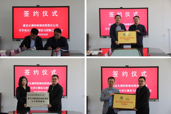 签约仪式热烈而庄重,张剑飞与赵相隶共同签署了实习基地协议,陈志强为北满特钢进行实习基地授牌,于晓敏接受赵相隶人才培训基地授牌,李艳东接受李海洋实习基地授牌。
