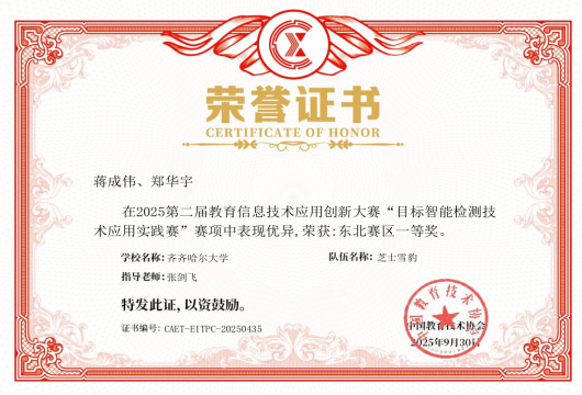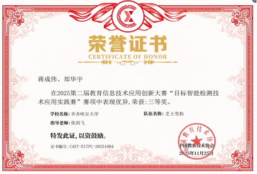 本次大赛聚焦领域信息技术的创新应用与实践落地,其中,“目标智能检测技术应用实践赛”赛项更是针对前沿技术在具体场景的落地能力展开比拼。团队凭借对目标智能检测技术的理解与场景的适配实践,从众多参赛队伍中脱颖而出。这一奖项获得不仅是对项目团队专业能力的肯定,更充分彰显了我院在深化和提升研究生在人工智能技术应用能力培养方面的扎实成效。
