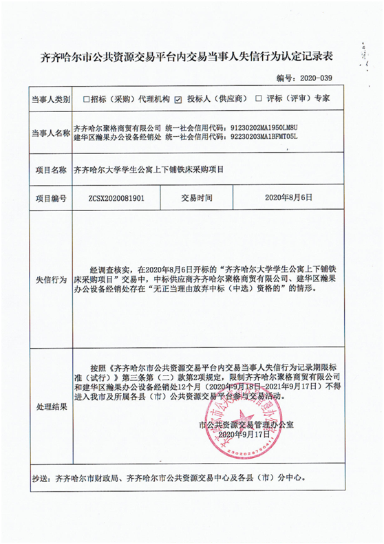 下一条:齐齐哈尔市公共资源交易平台内交易当事人失信行为认定记录表(转自齐齐哈尔市公共资源交易中心网)