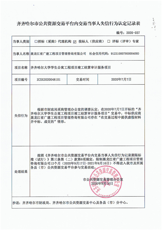 上一条:齐齐哈尔市公共资源交易平台内交易当事人失信行为认定记录表(转自齐齐哈尔市公共资源交易中心网)