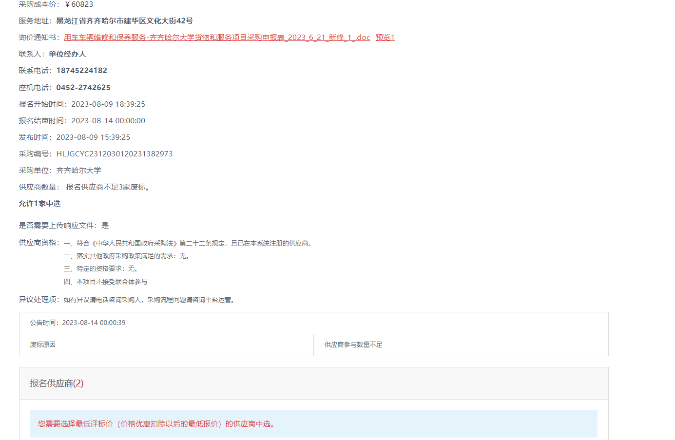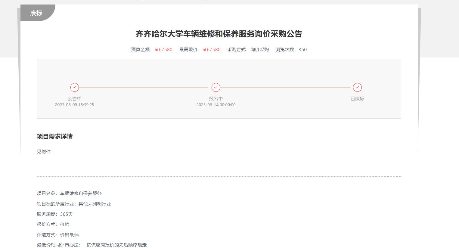 上一条:齐齐哈尔大学车辆维修和保养服务(第2次)询价采购公告(转自黑龙江省政府采购网)
