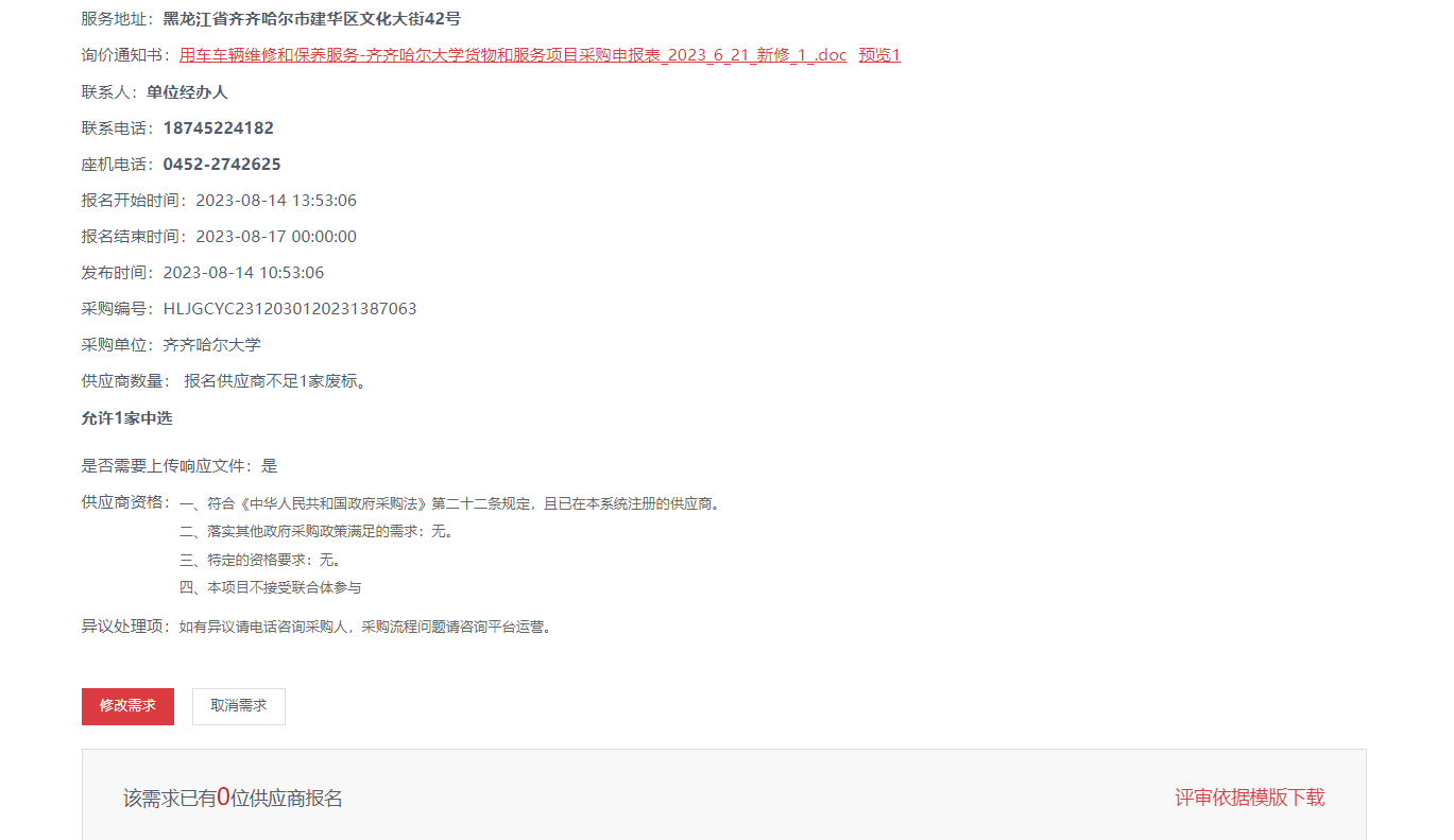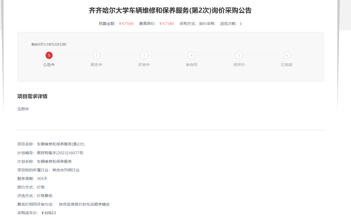 下一条:齐齐哈尔大学车辆维修和保养服务询价采购公告(废标)(转自黑龙江省政府采购网)
