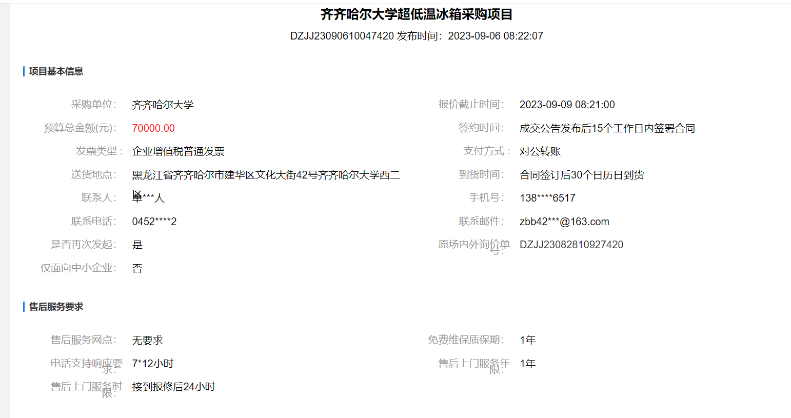齐齐哈尔大学超低温冰箱采购项目(二次)(转自黑龙江省政府采购网)
