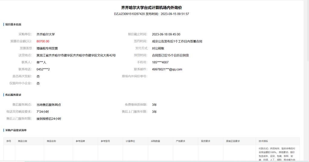 齐齐哈尔大学台式计算机场内外询价(第二次发布)(转自黑龙江省政府采购网)