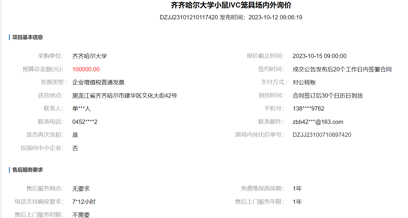 下一条:齐齐哈尔大学小鼠IVC笼具场内外询价(废标)(转自黑龙江省政府采购网)