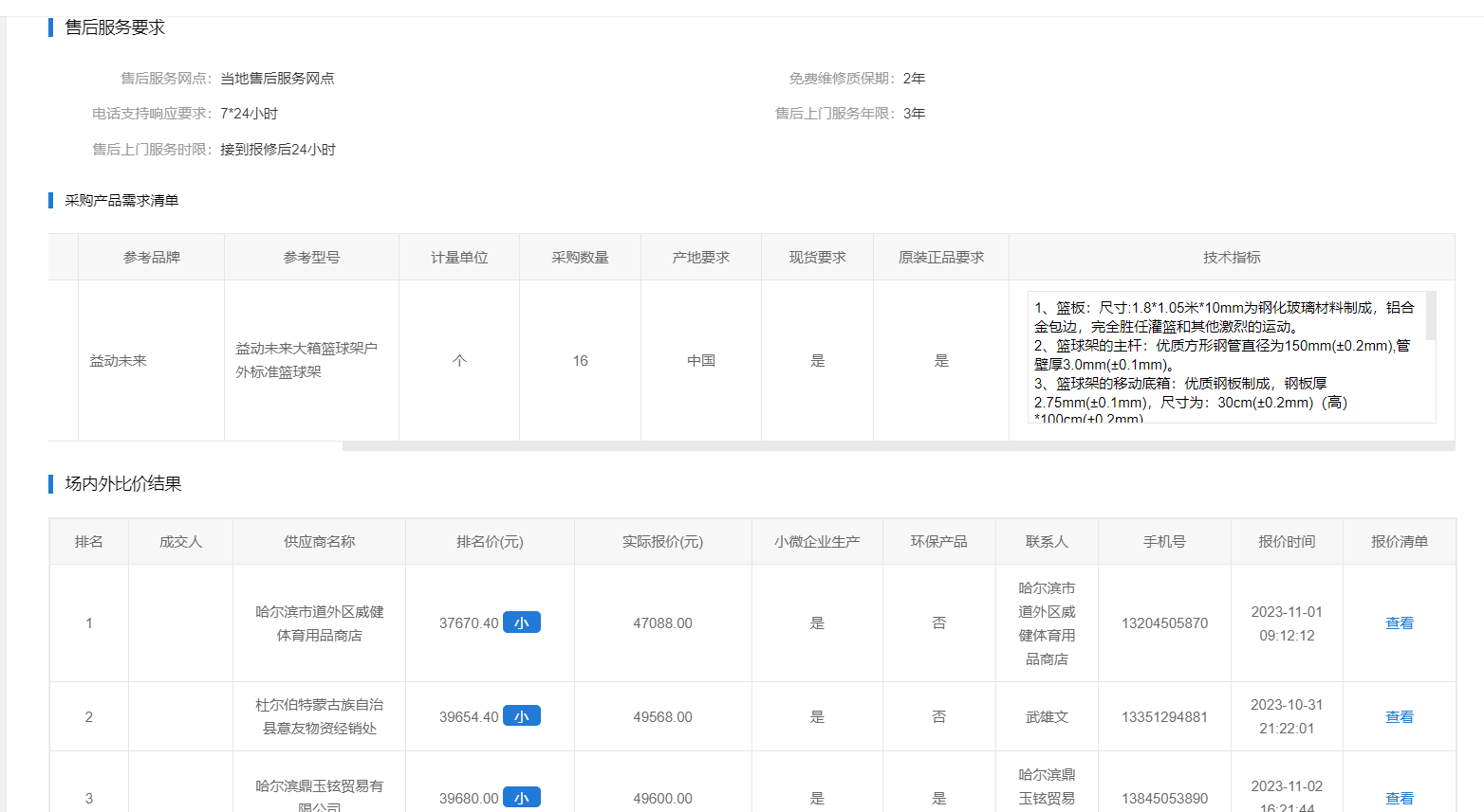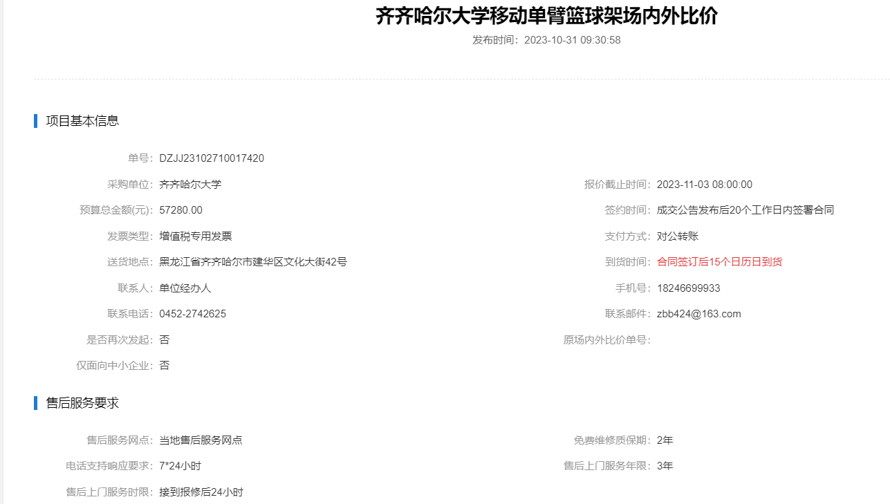 上一条:齐齐哈尔大学移动单臂篮球架场内外比价(二次)(转自黑龙江省政府采购网)