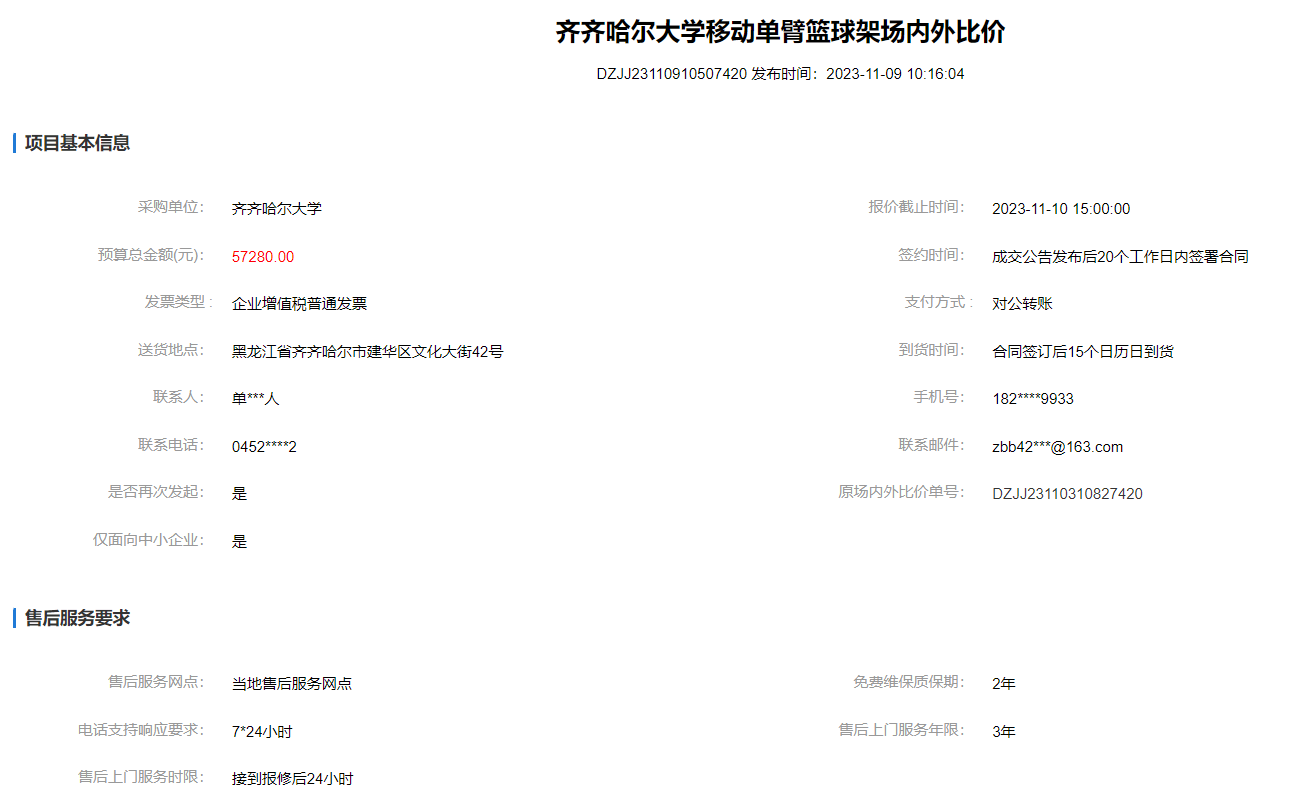 下一条:齐齐哈尔大学移动单臂篮球架场内外比价(废标)(转自黑龙江省政府采购网)