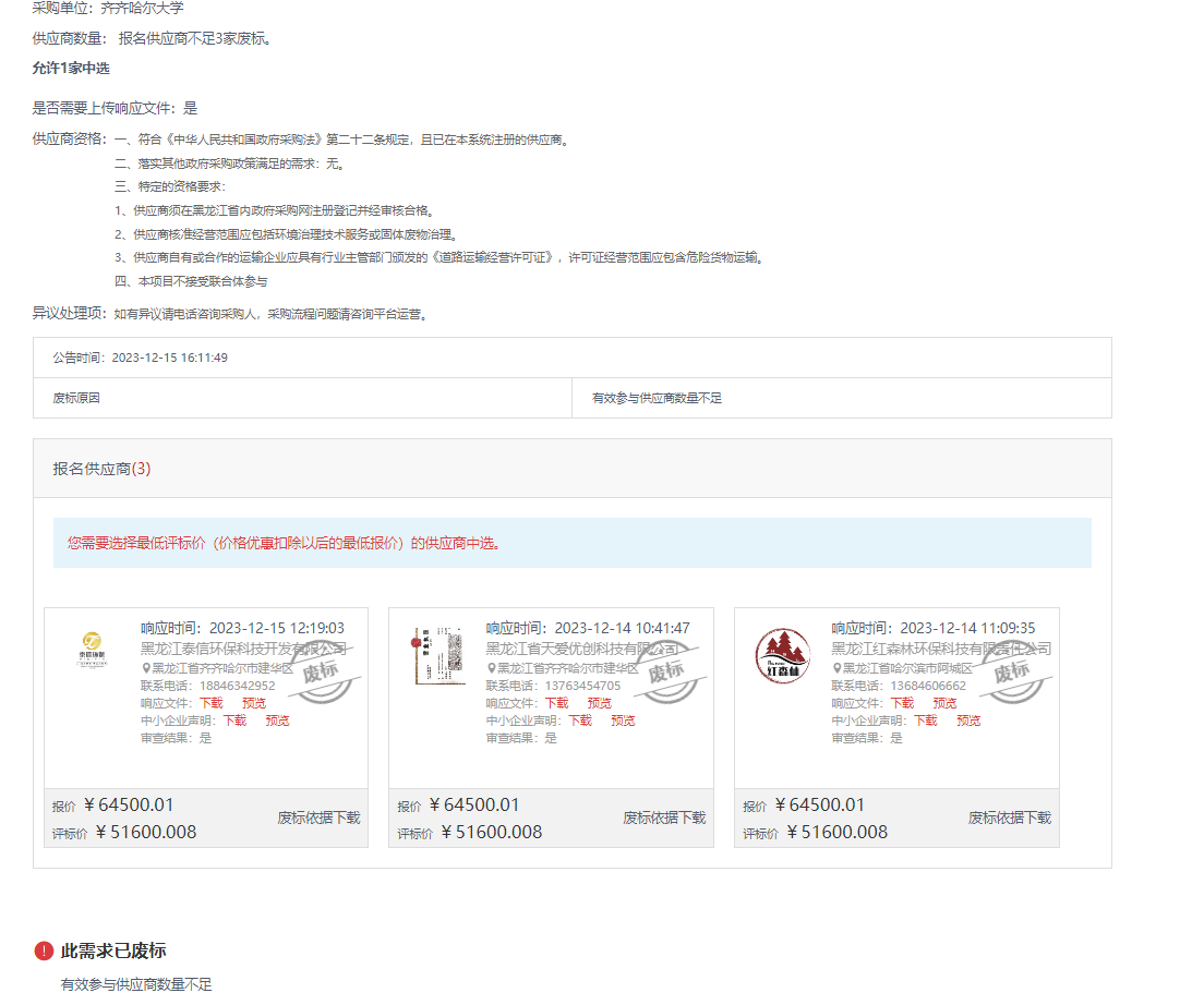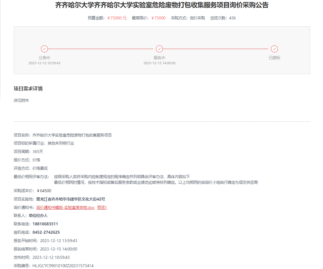 下一条:齐齐哈尔大学实验室危险废物处置项目成交公告(转自中国政府采购网)
