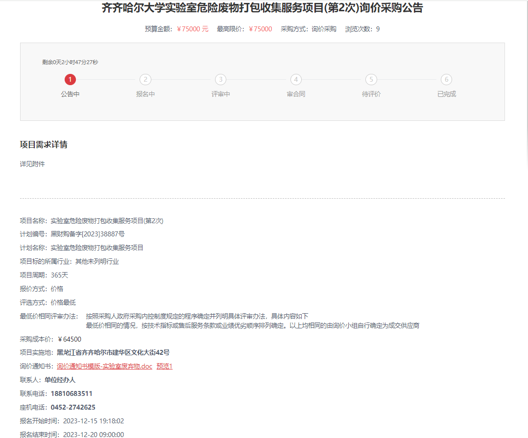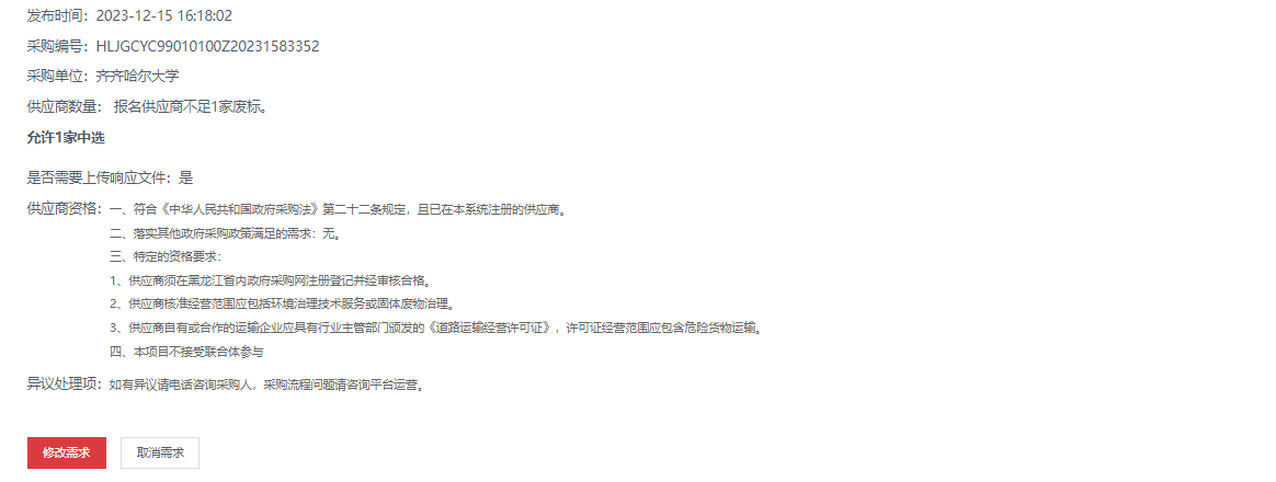 下一条:齐齐哈尔大学齐齐哈尔大学实验室危险废物打包收集服务项目询价采购公告(转自黑龙江省政府采购网)