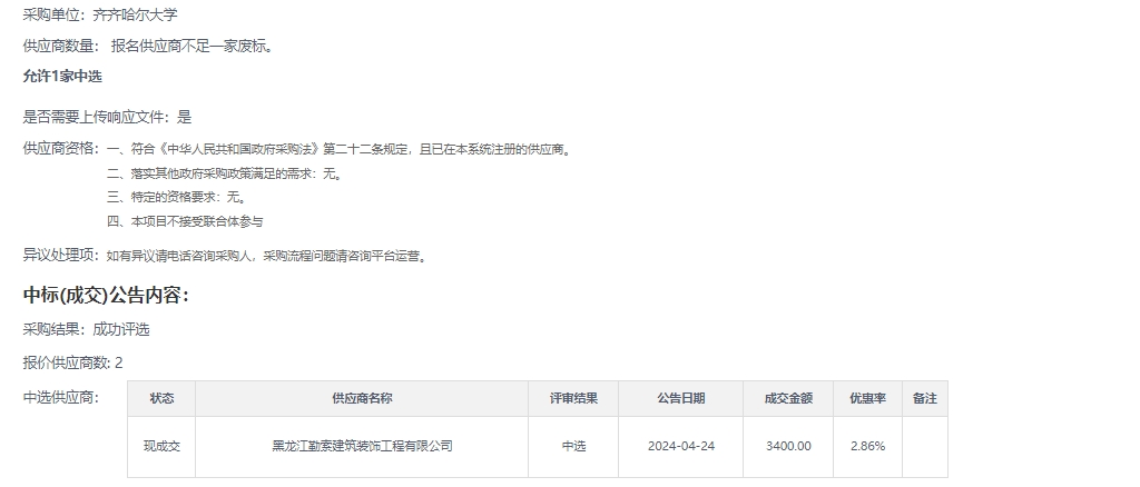 下一条:齐齐哈尔大学化学与化学工程学院实验耗材及通信与电子工程学院实验杂品采购更正公告(转自中国政府采购网)