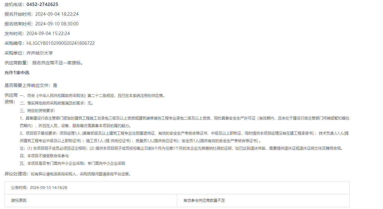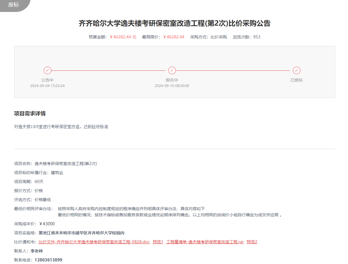 上一条:齐齐哈尔大学逸夫楼考研保密室改造工程(第3次)比价采购公告(转自黑龙江省政府采购网)