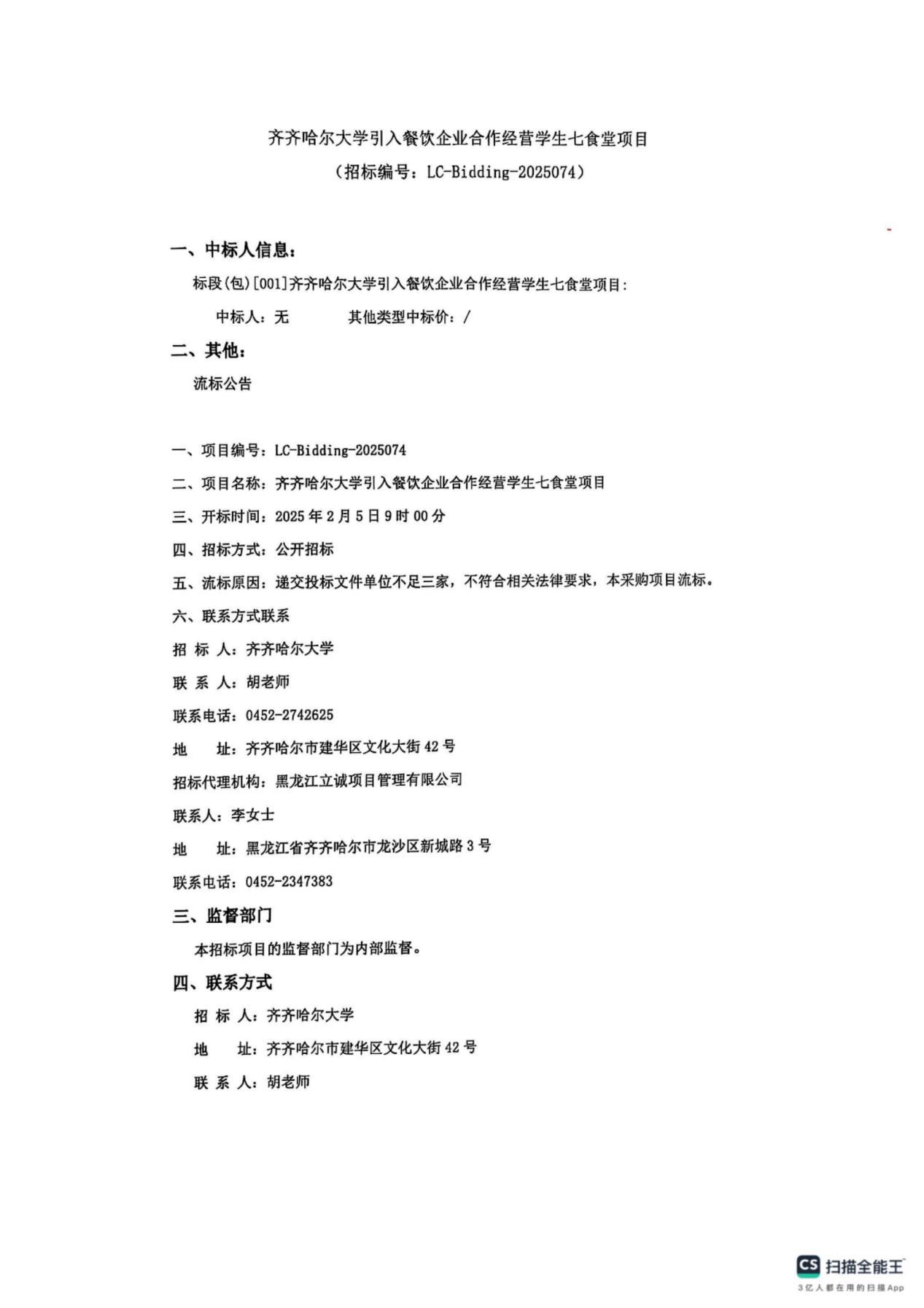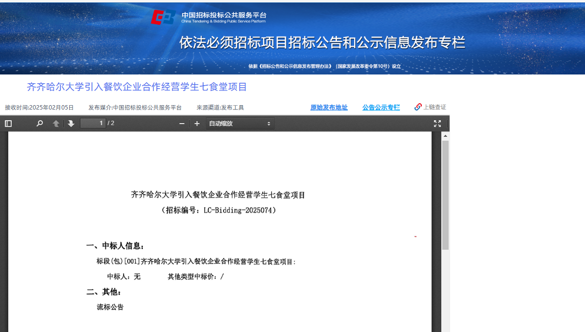 上一条:齐齐哈尔大学引入餐饮企业合作经营学生七食堂项目(二次)(转自中国招标投标公共服务平台)