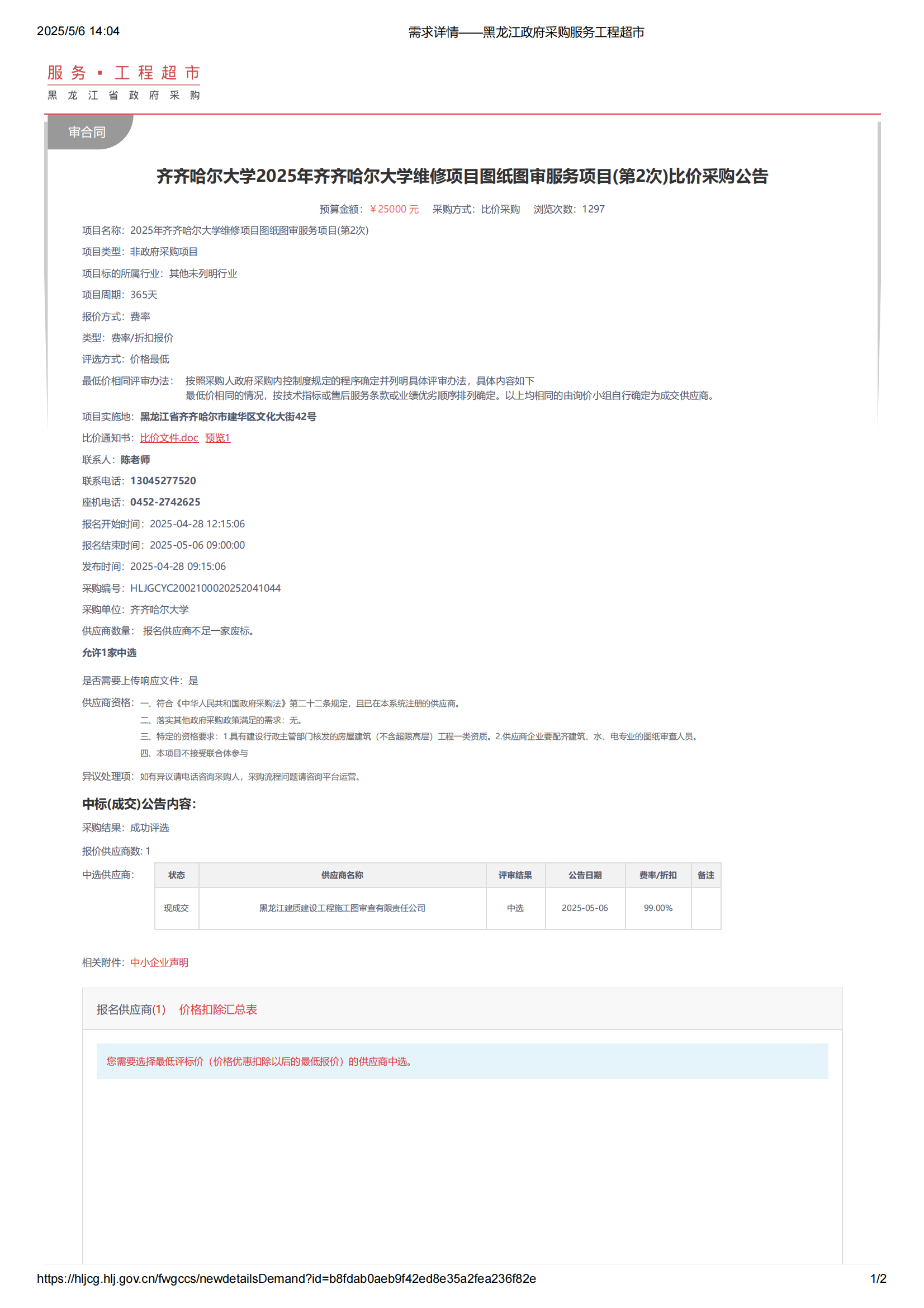 2025年齐齐哈尔大学维修项目图纸图审服务项目(第2次)比价采购结果公告(转自黑龙江省政府采购网)