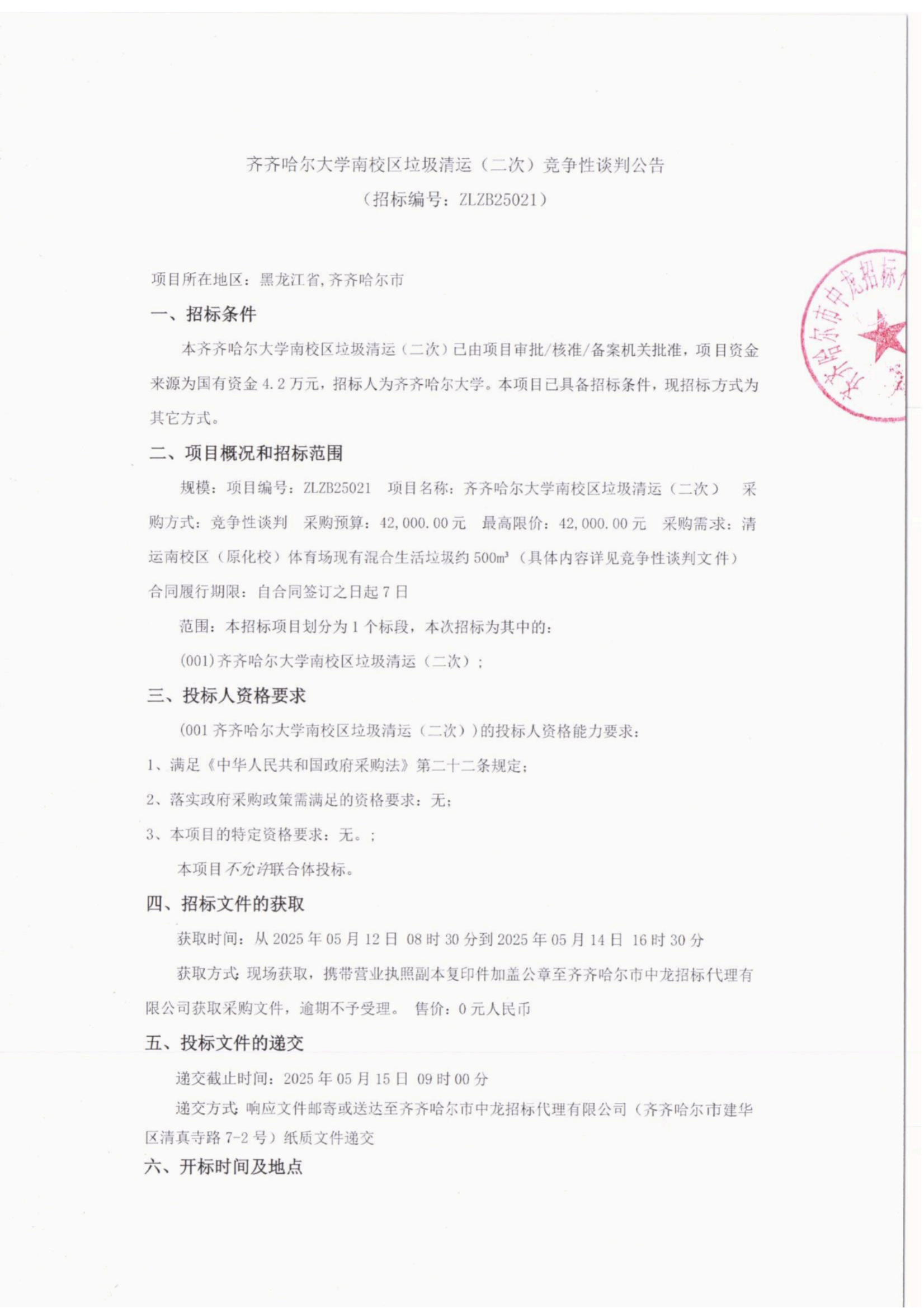 上一条:齐齐哈尔大学南校区垃圾清运流标公告(转自中国招标投标公共服务平台)