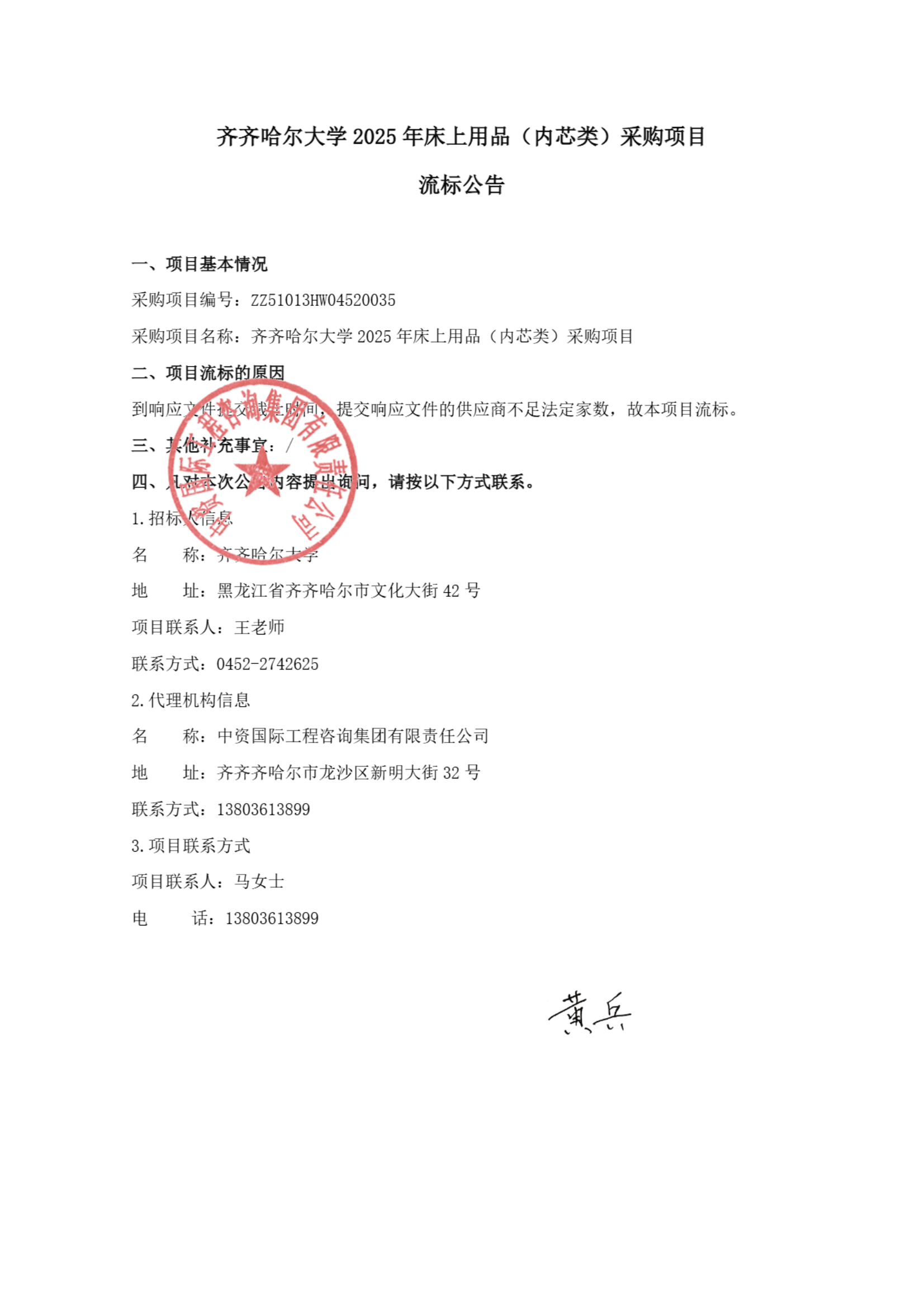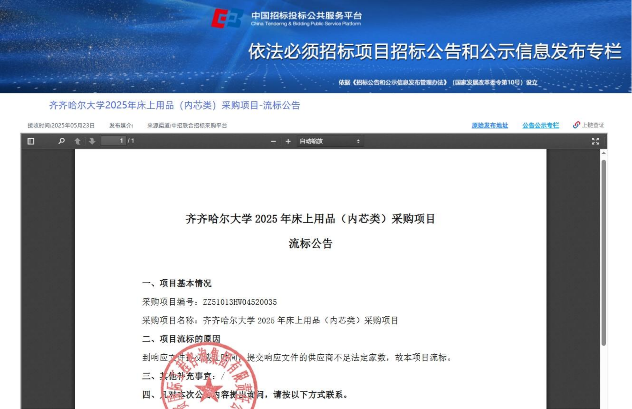 下一条:齐齐哈尔大学2025年床上用品(单罩类)采购项目-流标公告(转自中国招标投标公共服务平台)