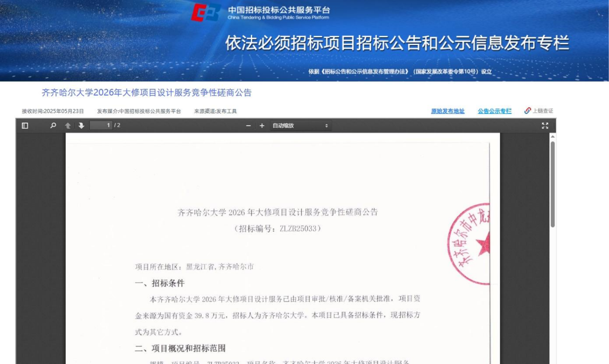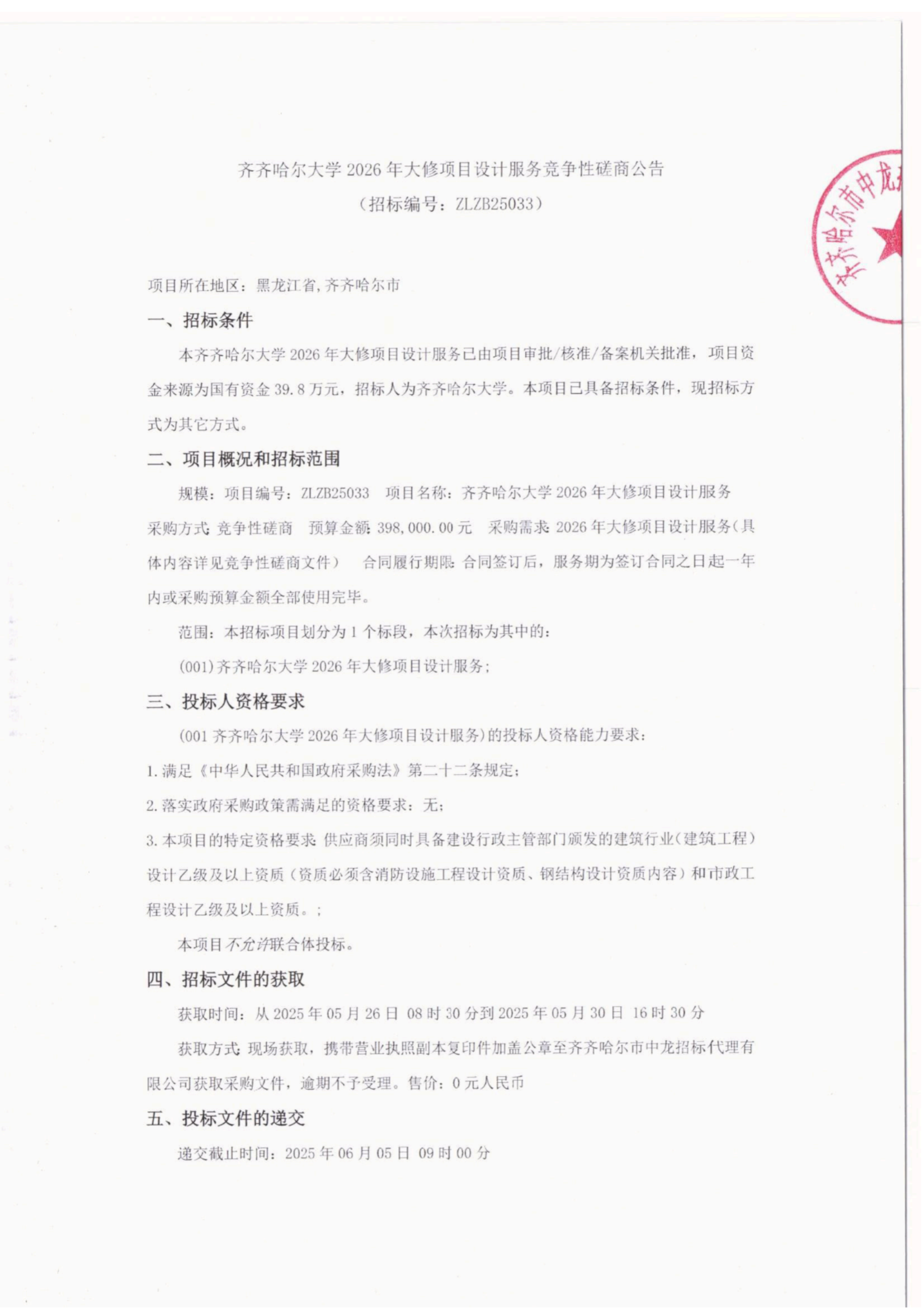 上一条:齐齐哈尔大学清冰雪服务-竞争性谈判公告(转自中国招标投标公共服务平台)