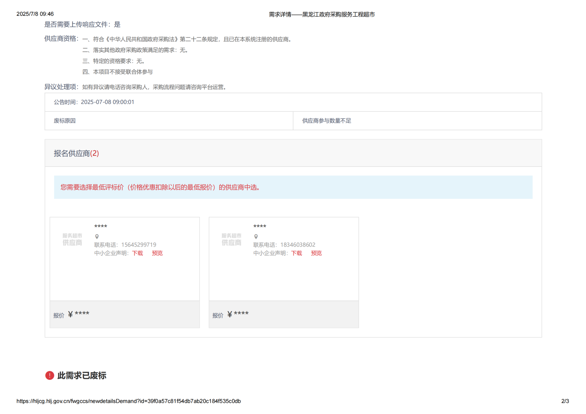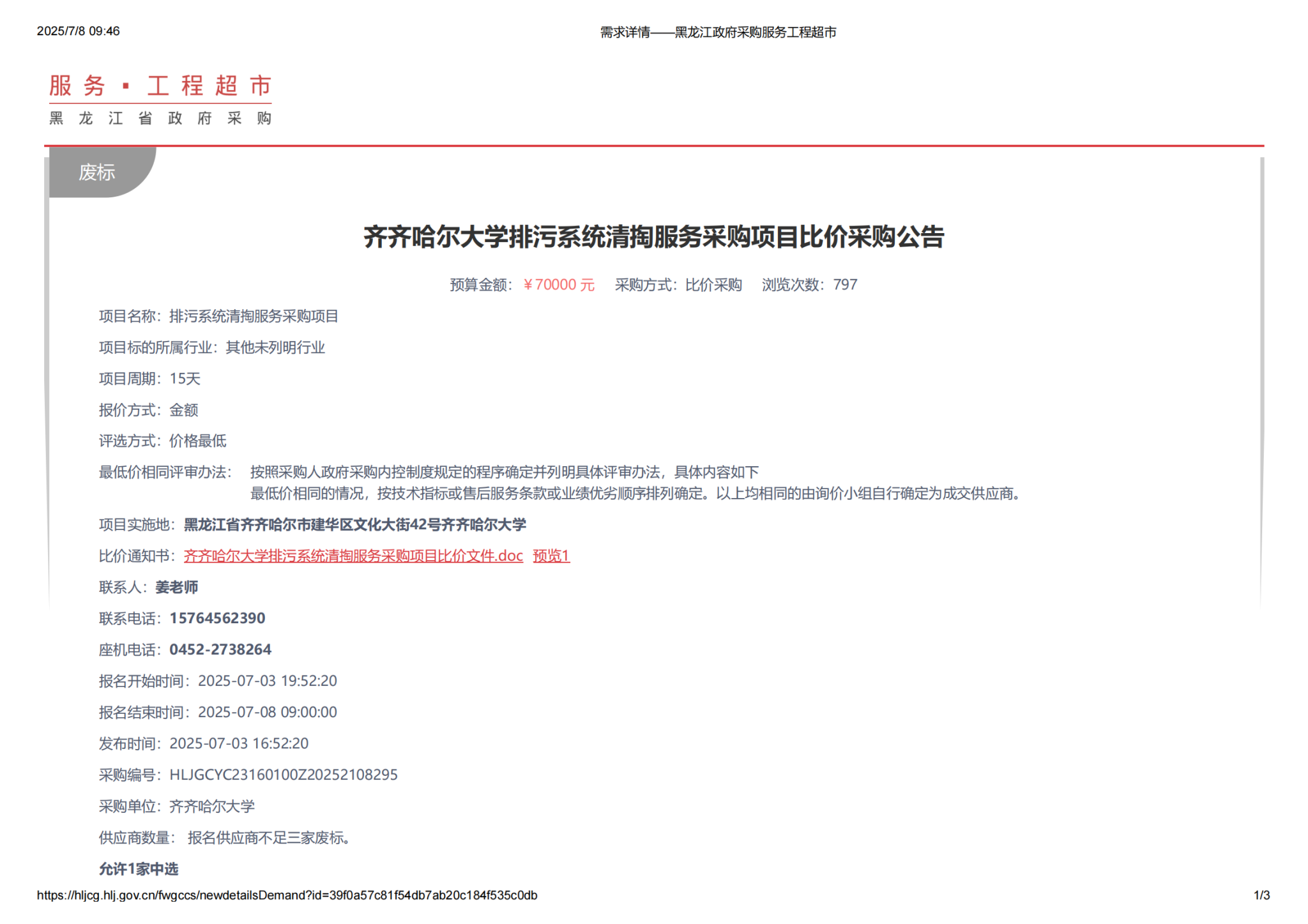 上一条:齐齐哈尔大学排污系统清掏服务采购项目(第2次)比价采购公告(转自黑龙江省政府采购网)