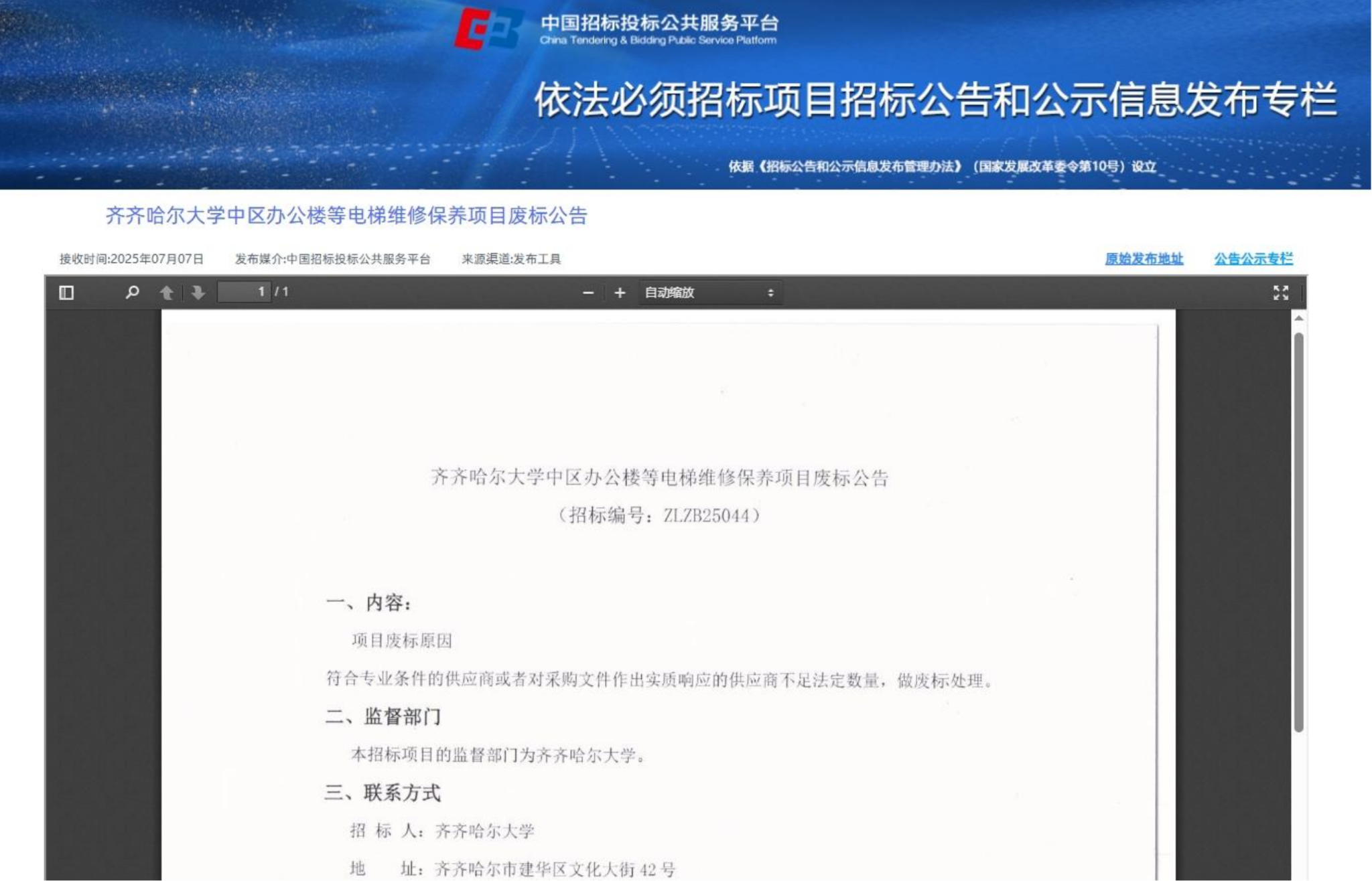 上一条:齐齐哈尔大学中国知网(CNKI)等中外文数据库采购采购实行单一来源采购方式的公示(转自黑龙江省政府采购网)