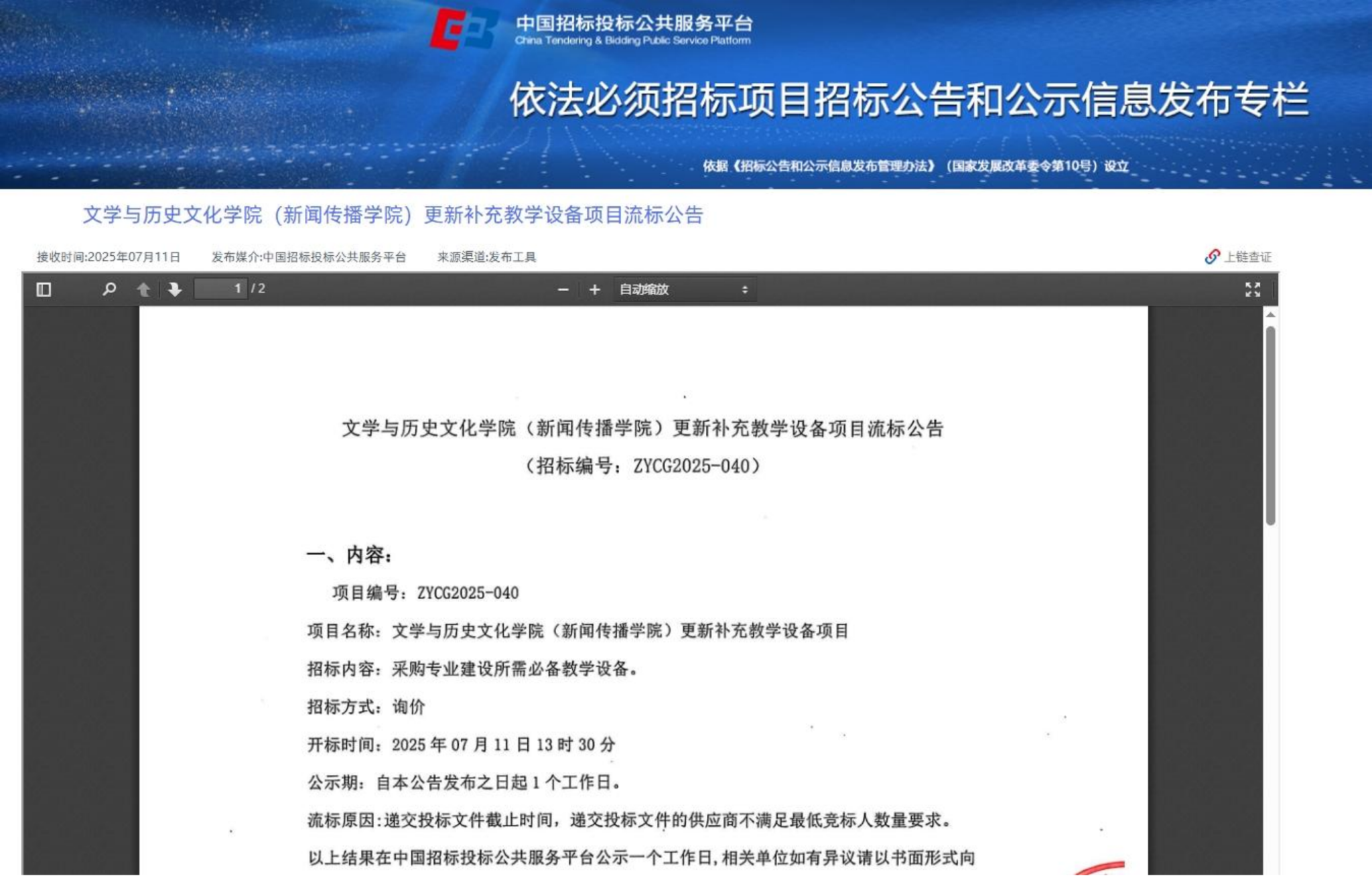 下一条:齐齐哈尔大学排污系统清掏服务采购项目(第2次)比价采购公告-废标公告(转自黑龙江省政府采购网)