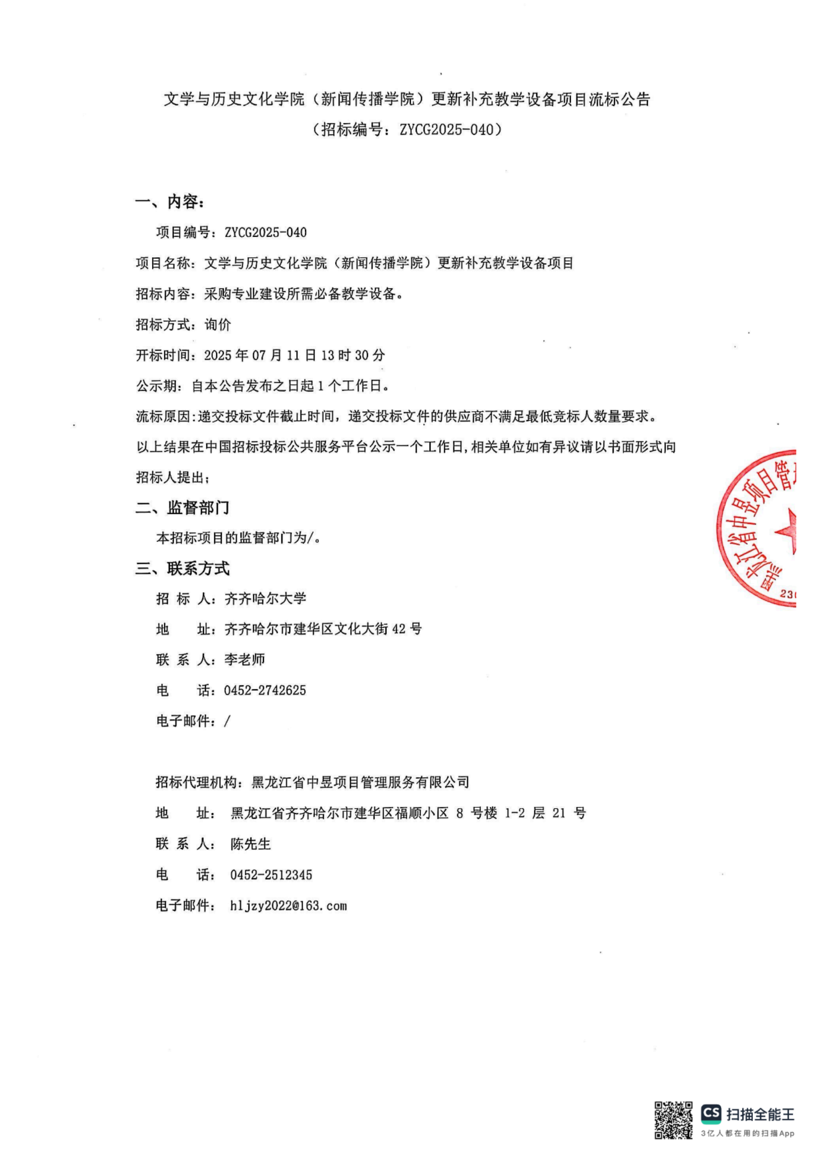 上一条:齐齐哈尔大学2025年水电暖房等应急及零星维修服务(第二批)结果公告(转自黑龙江省政府采购网)
