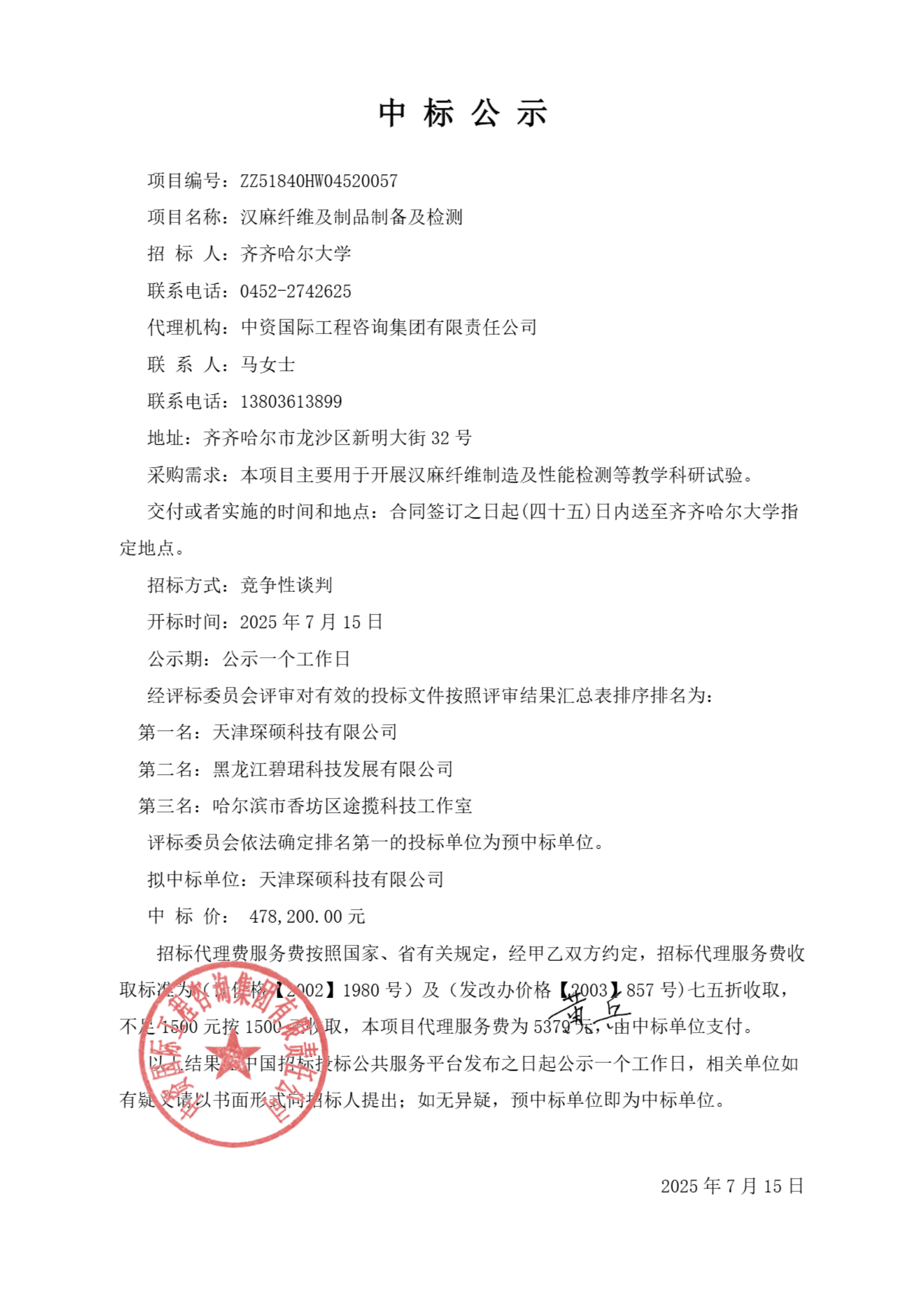 上一条:齐齐哈尔大学植物性食品加工技术优势特色学科分析检测仪器设备采购项目中标(成交)结果公告(转自黑龙江省政府采购网)