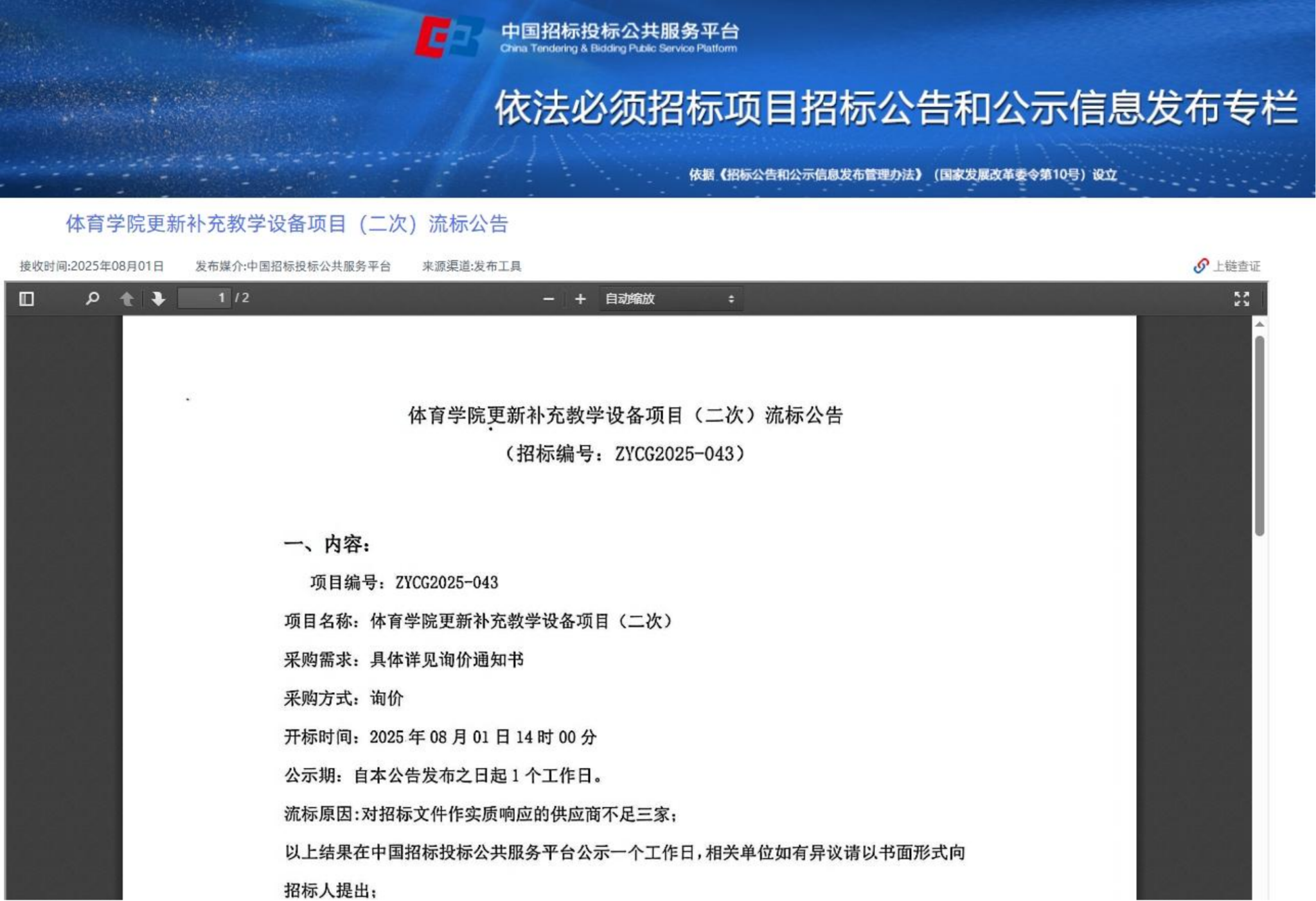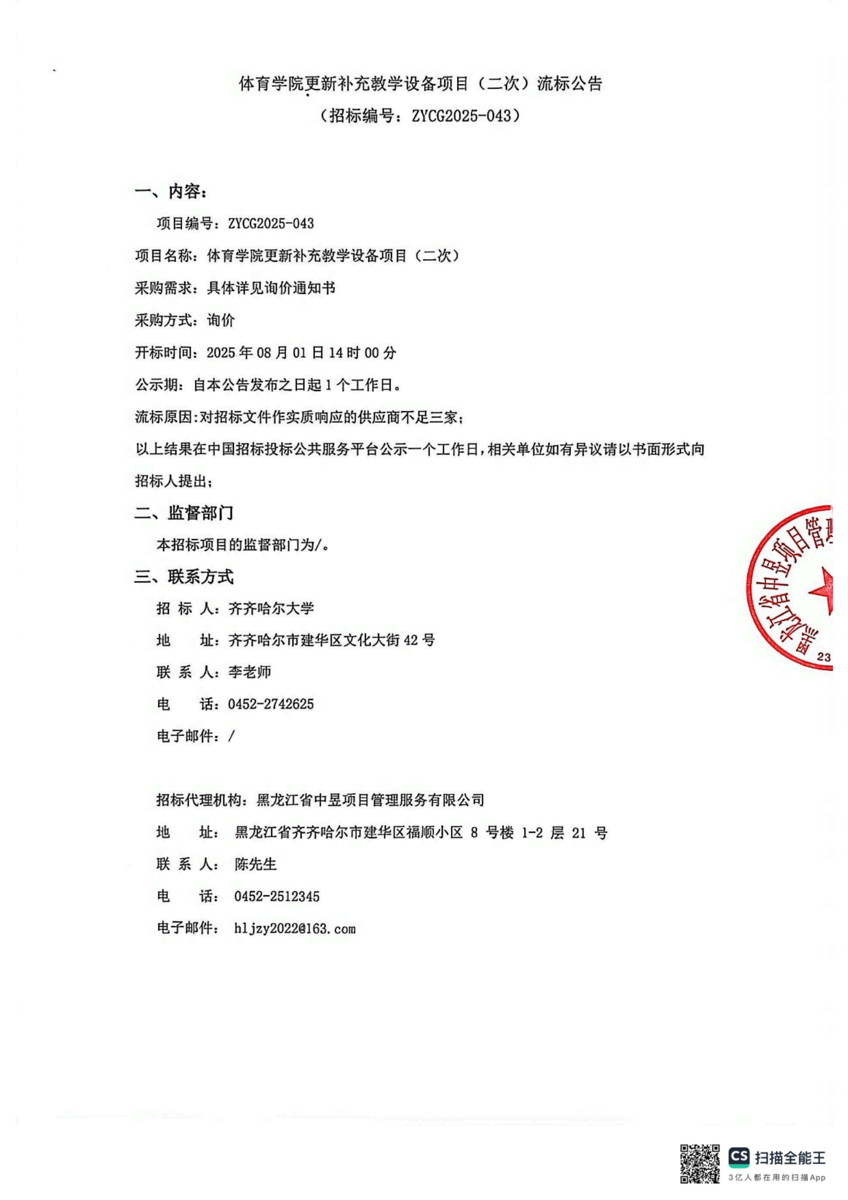 上一条:齐齐哈尔大学通信与电子工程学院补充更新教学设备项目结果公告(废标)(转自黑龙江省政府采购网)