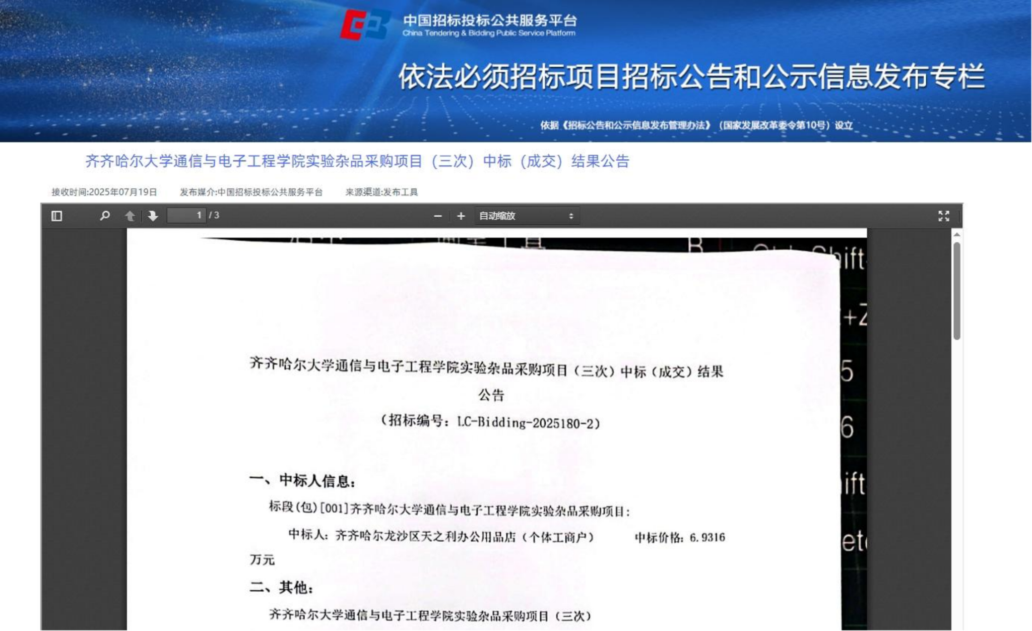 下一条:齐齐哈尔大学通信与电子工程学院补充更新教学设备项目结果公告(废标)(转自黑龙江省政府采购网)
