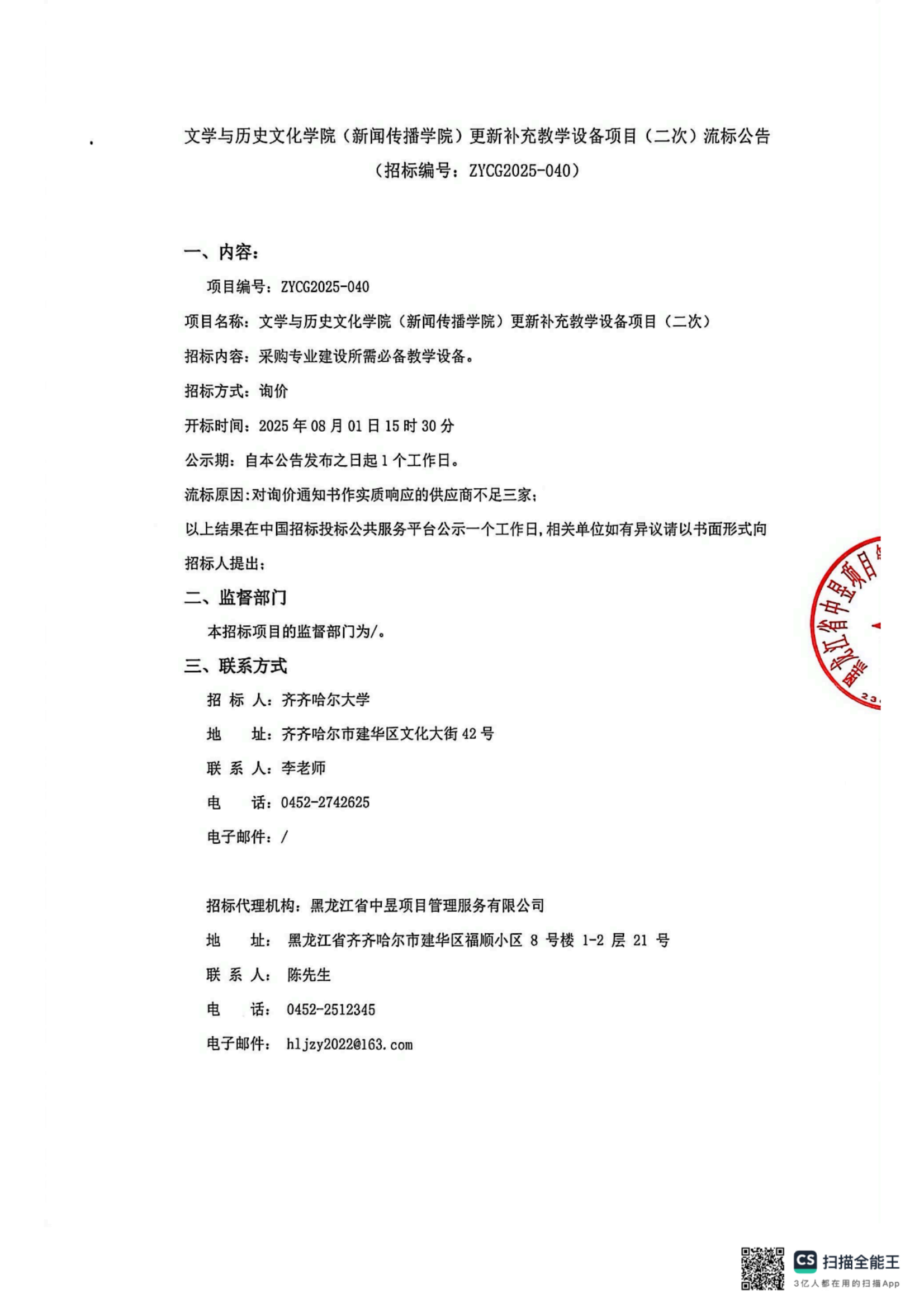 上一条:齐齐哈尔大学危险化学品暂存站维修(增加)项目比价采购公告-更正(转自黑龙江省政府采购网)