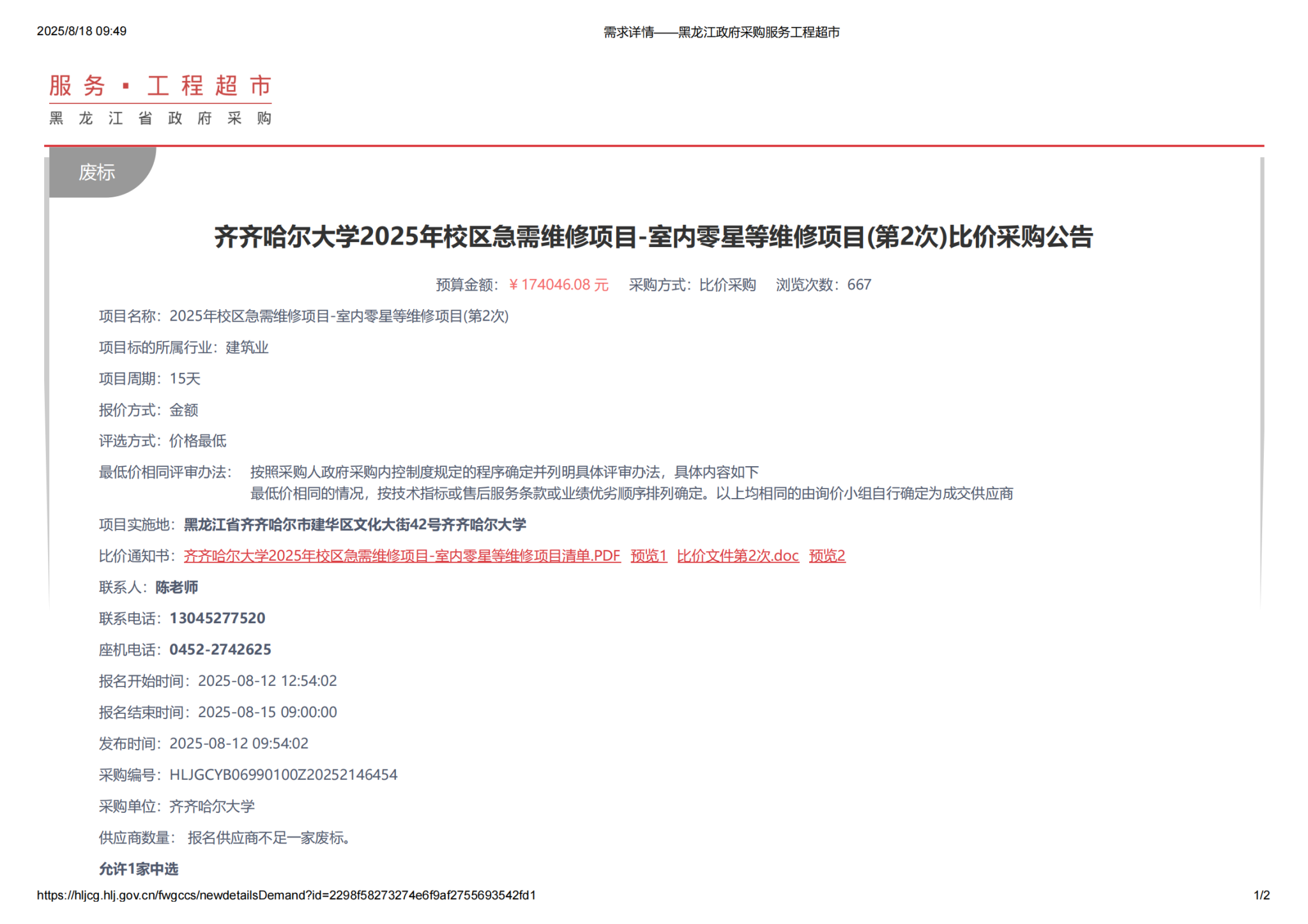 上一条:齐齐哈尔大学2025年校区急需维修项目-室内零星等维修项目(第3次)比价采购公告(转自黑龙江省政府采购网)