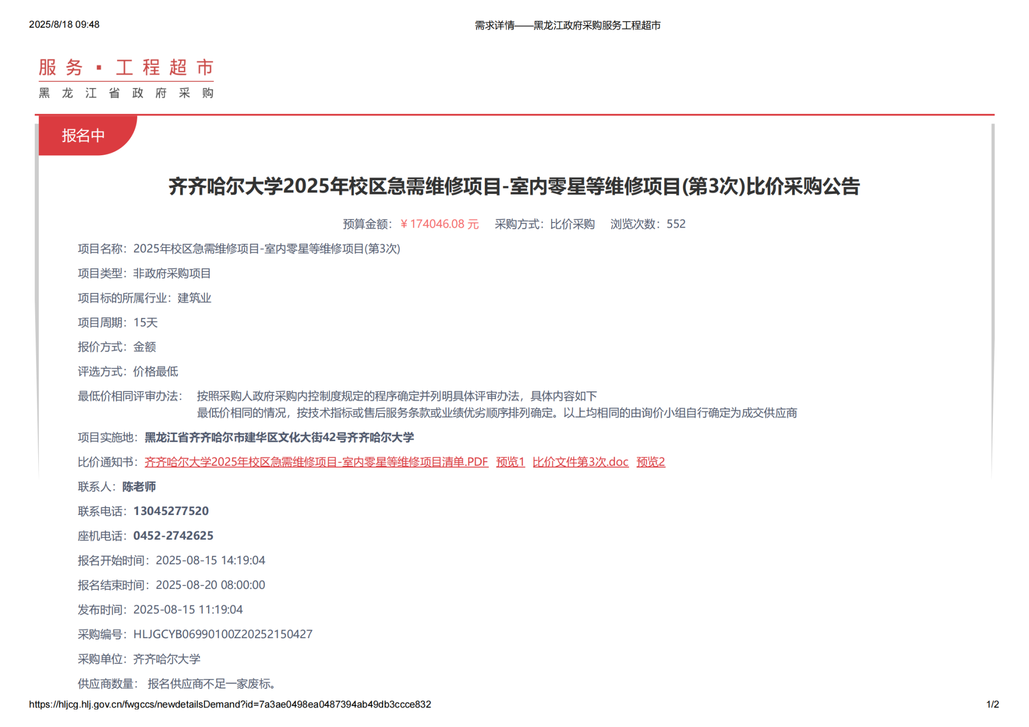 下一条:齐齐哈尔大学2025年校区急需维修项目-室内零星等维修项目(第2次)比价采购公告-废标(转自黑龙江省政府采购网)