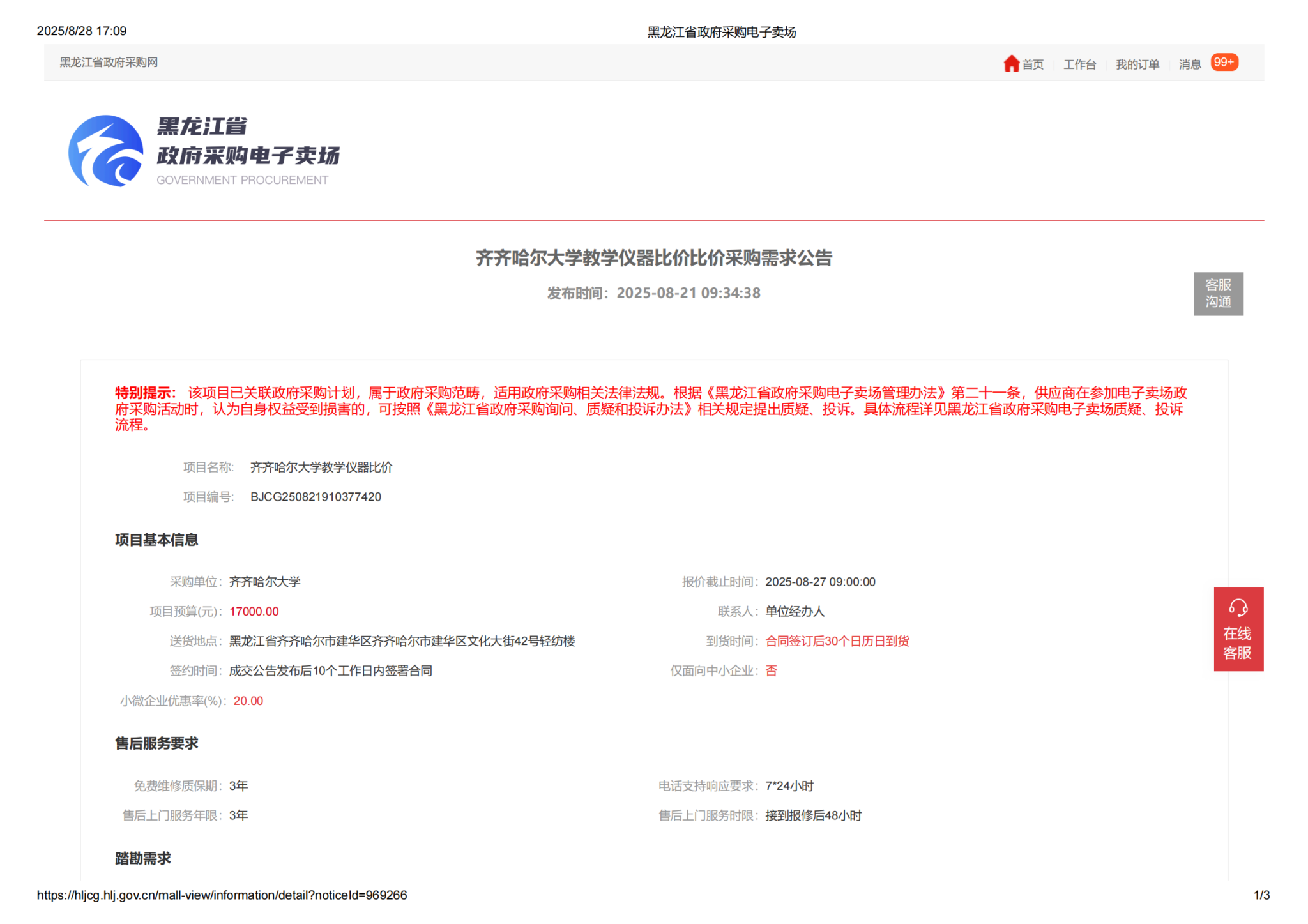 上一条:齐齐哈尔大学教学仪器比价采购废标公告(转自黑龙江省政府采购网)