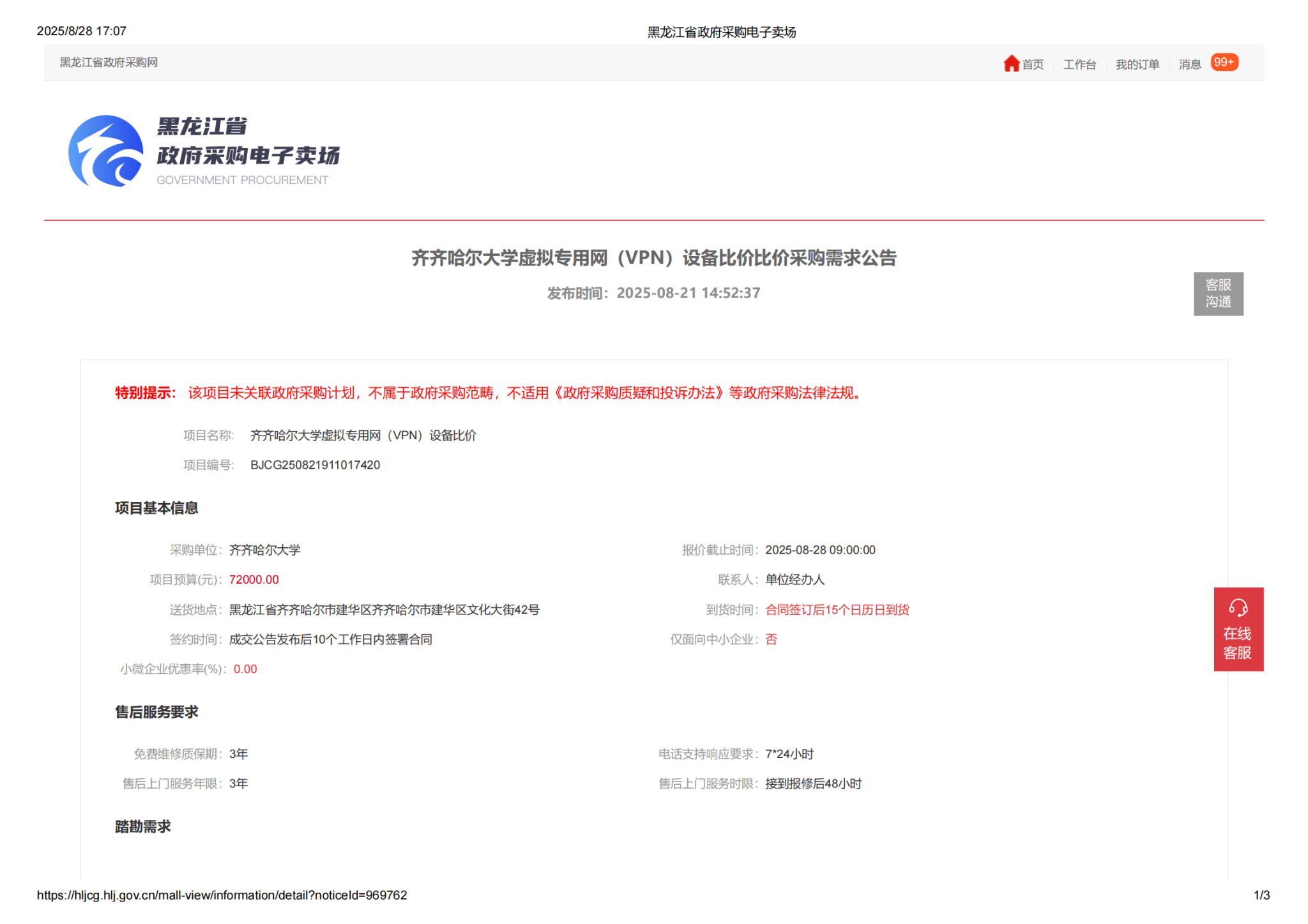 上一条:齐齐哈尔大学虚拟专用网(VPN)设备比价采购成交公告(转自黑龙江省政府采购网)