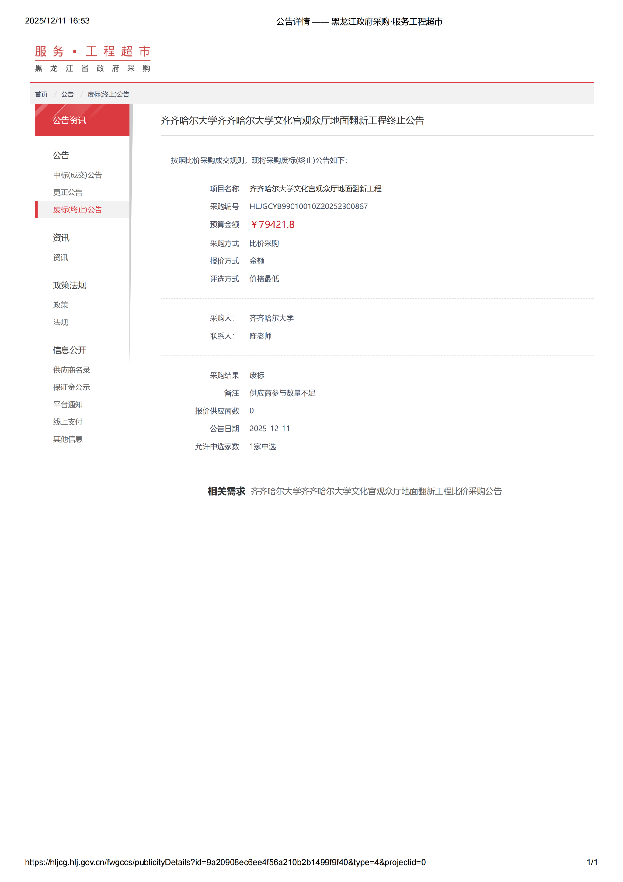 上一条:齐齐哈尔大学文化宫观众厅地面翻新工程(第2次)比价采购公告(转自黑龙江省政府采购网)