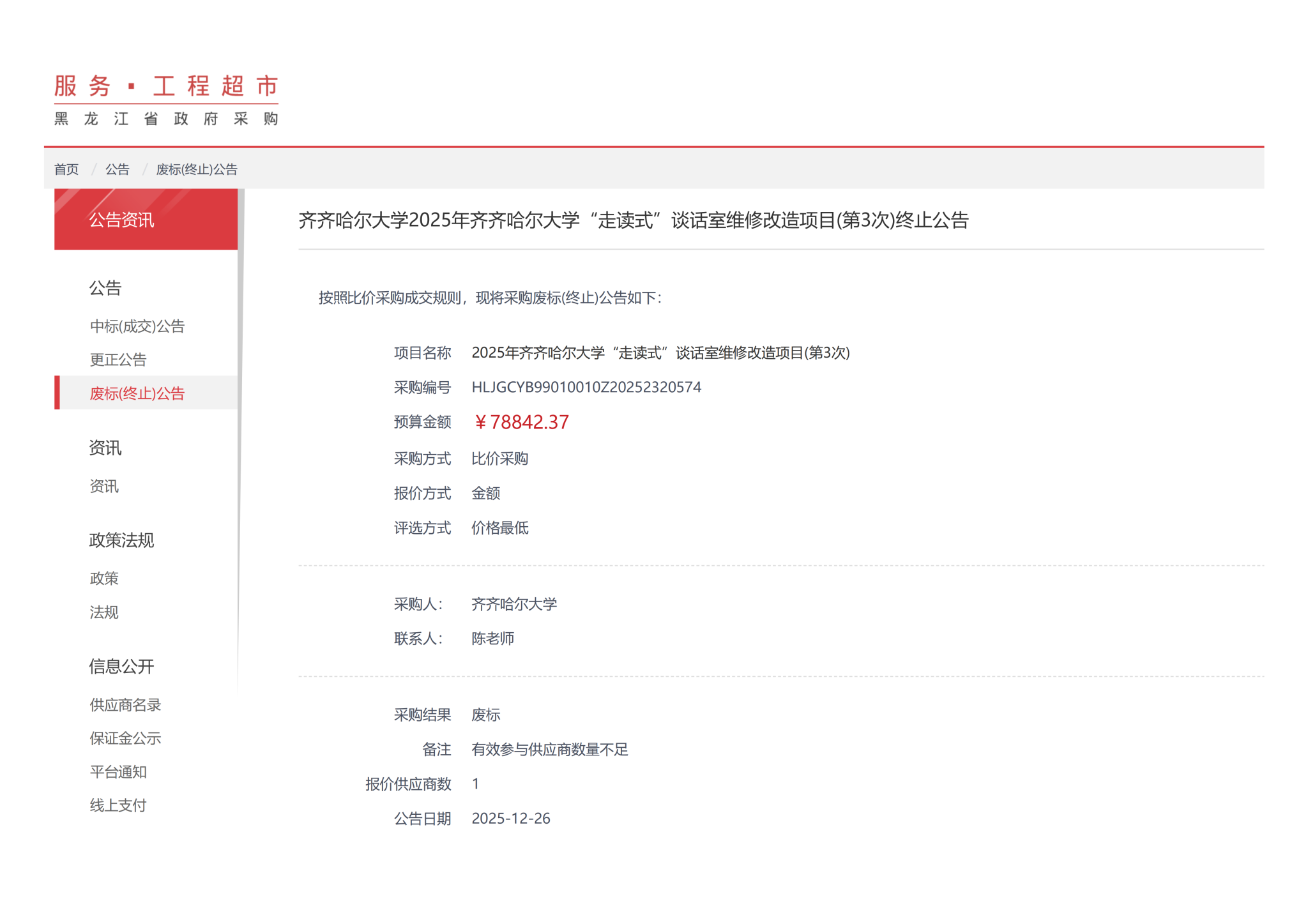 上一条:齐齐哈尔大学文化宫观众厅地面翻新工程(第3次)结果公告(转自黑龙江省政府采购网)