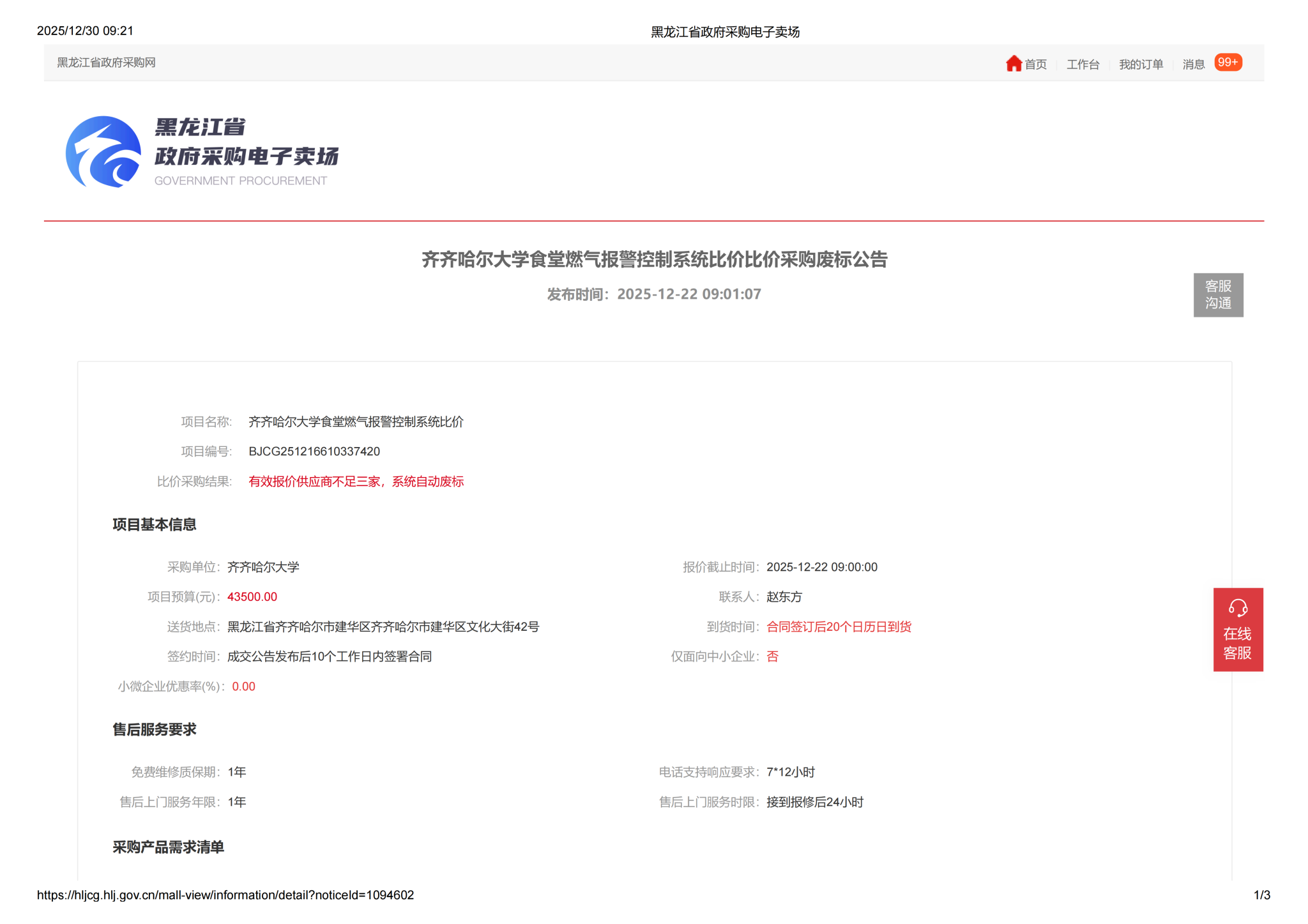 下一条:齐齐哈尔大学食堂燃气报警器控制系统比价采购需求公告(一次)(转自黑龙江省政府采购网)