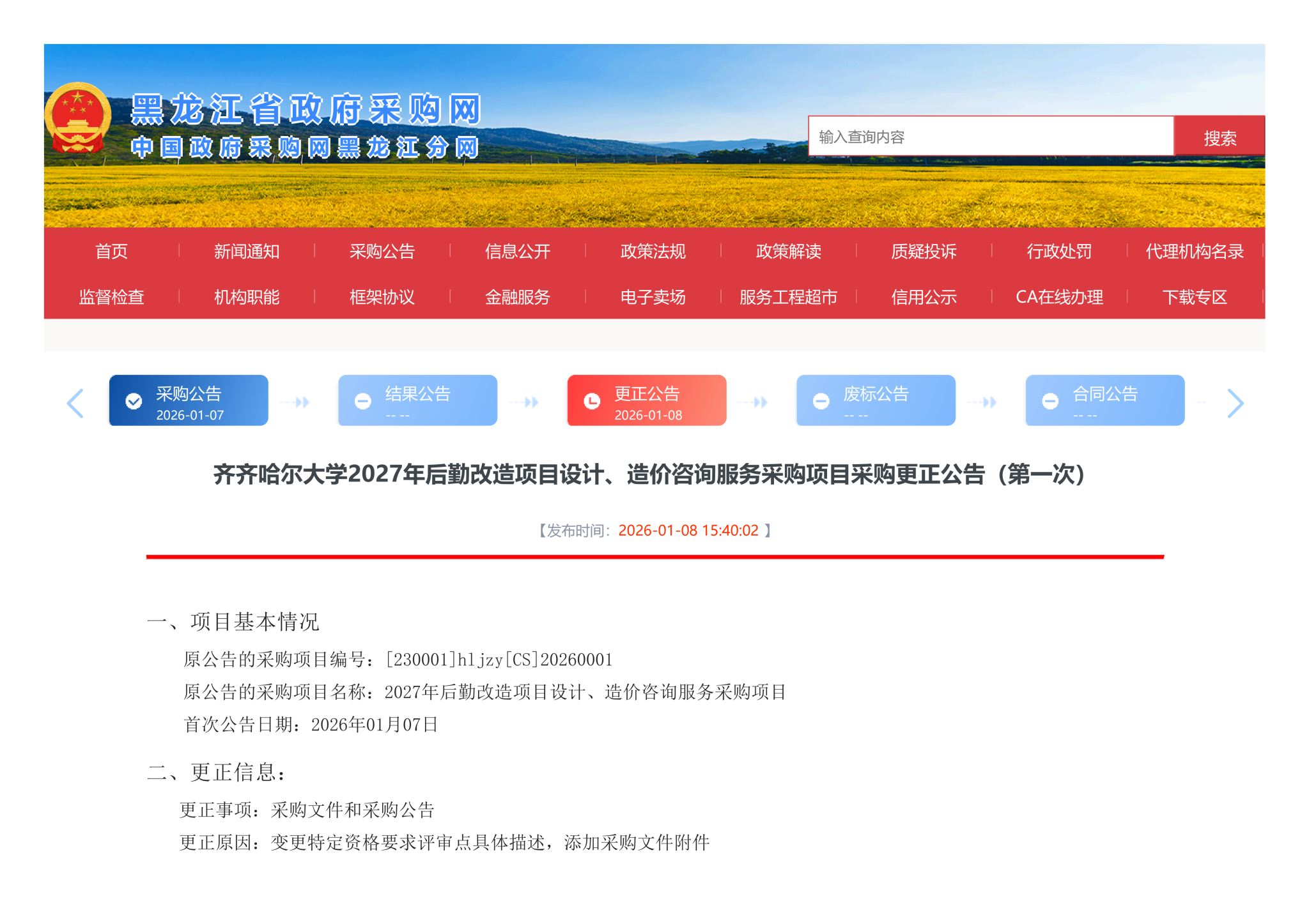 下一条:齐齐哈尔大学2027年后勤改造项目设计、造价咨询服务采购项目竞争性磋商公告(转自黑龙江省政府采购网)