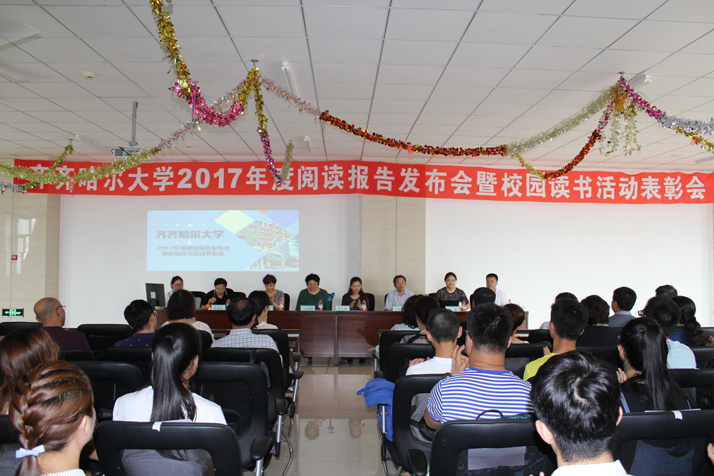 读有温度的书,遇见有趣的灵魂。7月11日上午,齐齐哈尔大学2017年度阅读报告发布会暨校园读书活动表彰会在图书馆东区馆8楼报告厅隆重举行。校党委副书记齐宏伟、副校长吕厚均出席了会议,宣传统战部部长王晓梅、校团委书记苏醒、图书馆党委书记胥军、馆长宋波,以及研究生部、各学院主管学生工作的领导、教师代表、学生代表参加了会议。会议由图书馆副馆长管振岐主持。