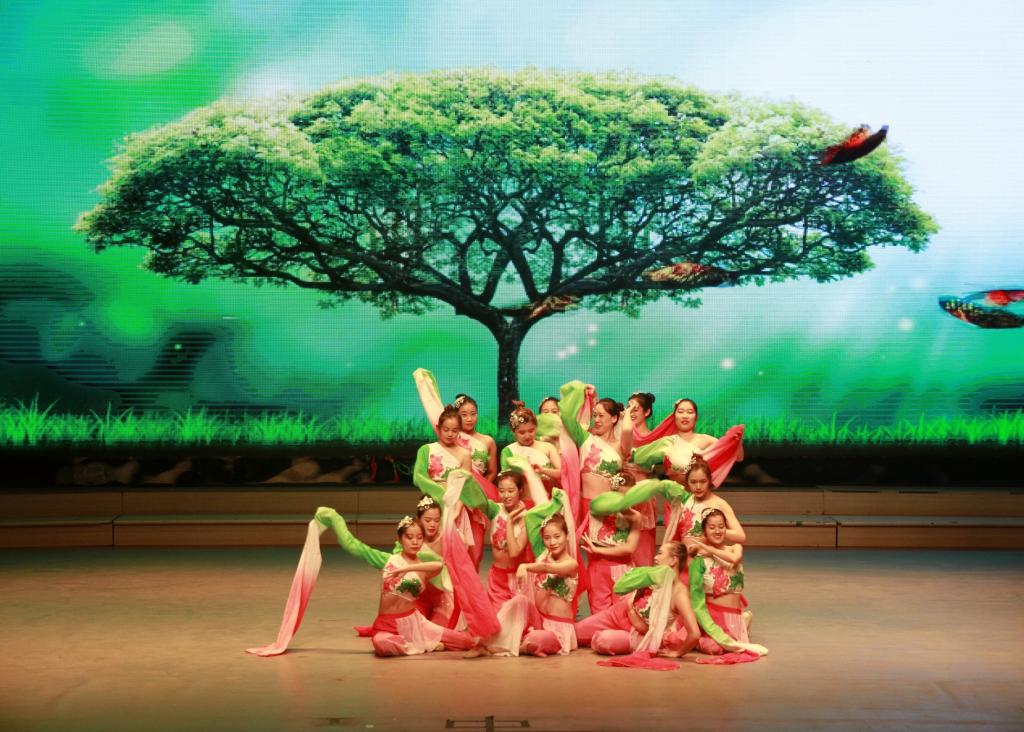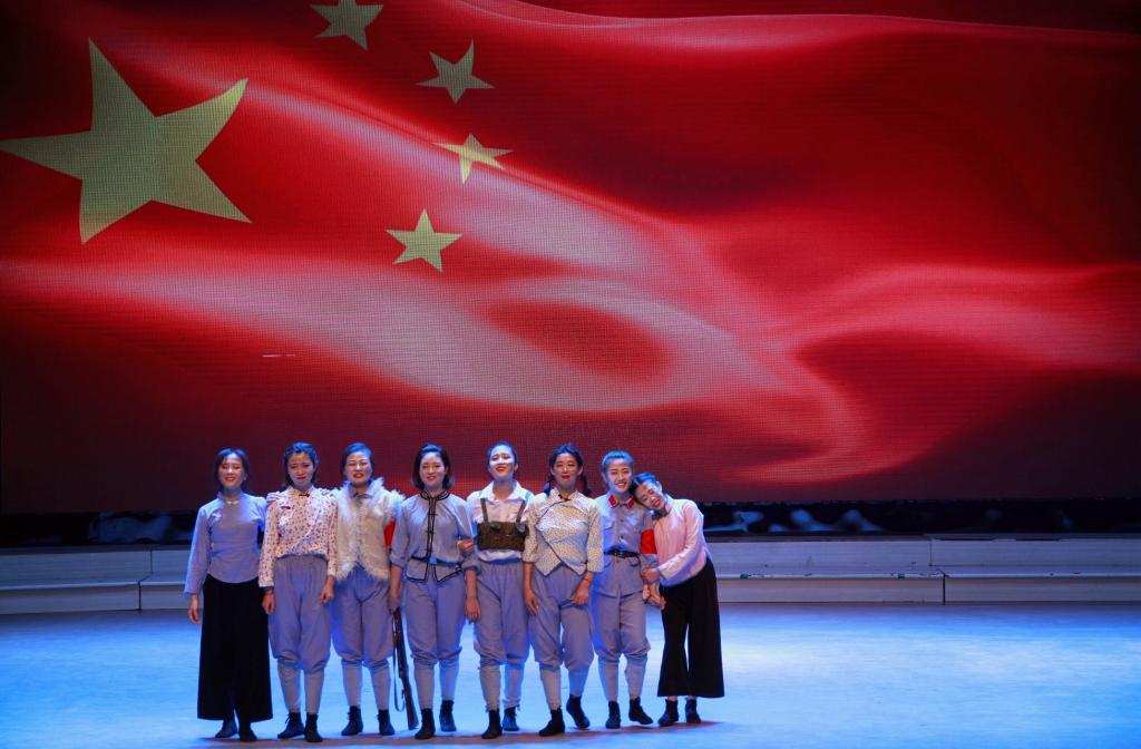 舞蹈系161班同学们表演了振奋人心的舞蹈作品《八女投江》,用形象的肢体语言表现了八位烈士宁死不屈、英勇献身的精神。