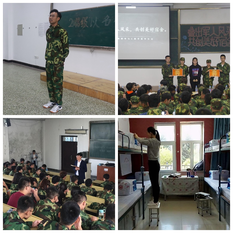 为了丰富新生军训期间的文化生活,文学与历史文化学院开展了“缘聚文史 以名会友 ”活动,大一新生们纷纷自告奋勇地走上讲台介绍自己,活动中,同学尽显多才多艺,青春洋溢,有的同学用歌声介绍自己,有的同学用家乡话介绍自己,更有来自西藏的同学一展风采,为大家带来了独具民族特色的歌曲,大家用真挚的语言充分表达了对大学生活的憧憬与期待;为检验军训阶段训练成果,提高学生内务整理水平,9月6日18:30材料科学与工程学院在1教J403室举办“叠出军人风采,共创美好宿舍”叠军被比赛,同学们在规定的时间内高质量地完成了任务,压、量、切、扣、修一气呵成,技术娴熟、动作流畅,充分展现了军训中内务卫生的训练成果,为今后舍务管理打下了良好的基础;为了让新生在军训中学习到部队军人身上严守军纪、令行禁止的纪律意识,提高新生对学校规章制度的认识和了解,8月24日—25日,机电工程学院组织参训新生进行了教育管理文件学习,通过辅导员高福生老师的细致讲解,使大一新生对学校的相关规定有了全面的认识,为新生们如何珍惜宝贵的大学时光指明了方向;理学院强化了新生早操训练,学院安排退伍复学的学生担任早训教官,早训教官们牺牲个人时间利用早操时间带领大家反复练习白天的军事训练科目,使学院的整体军事训练效果有了明显提高。