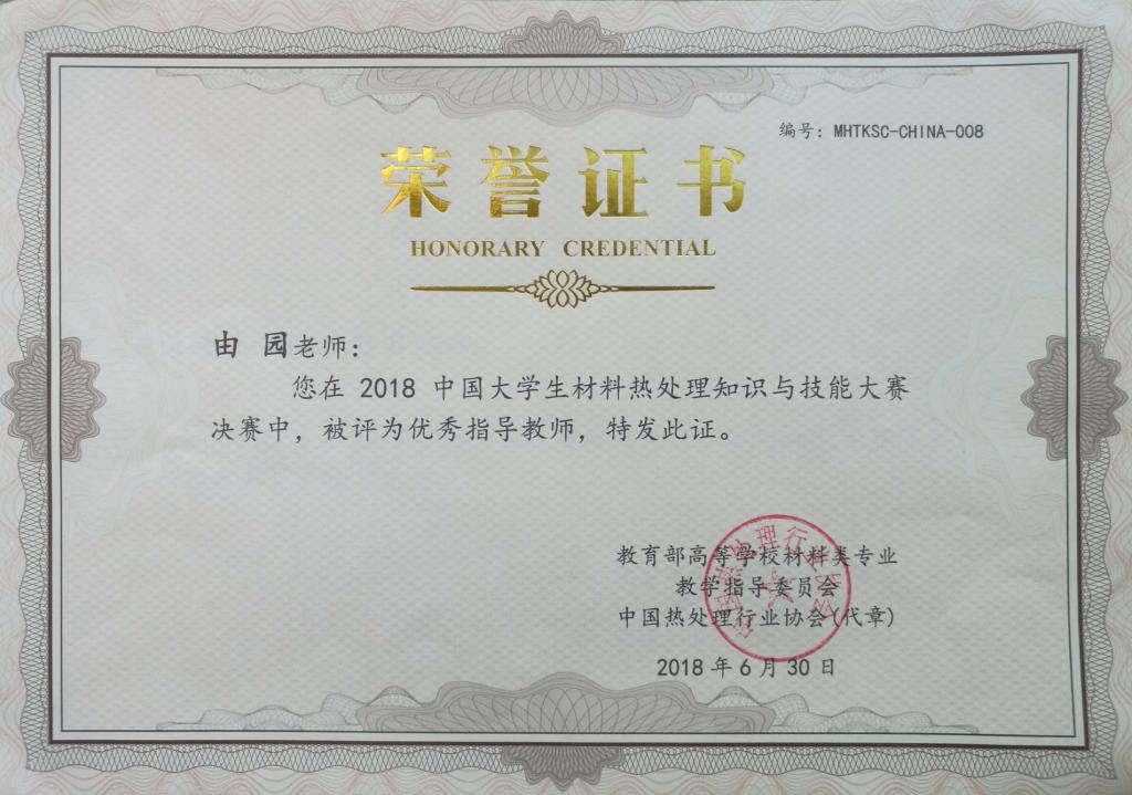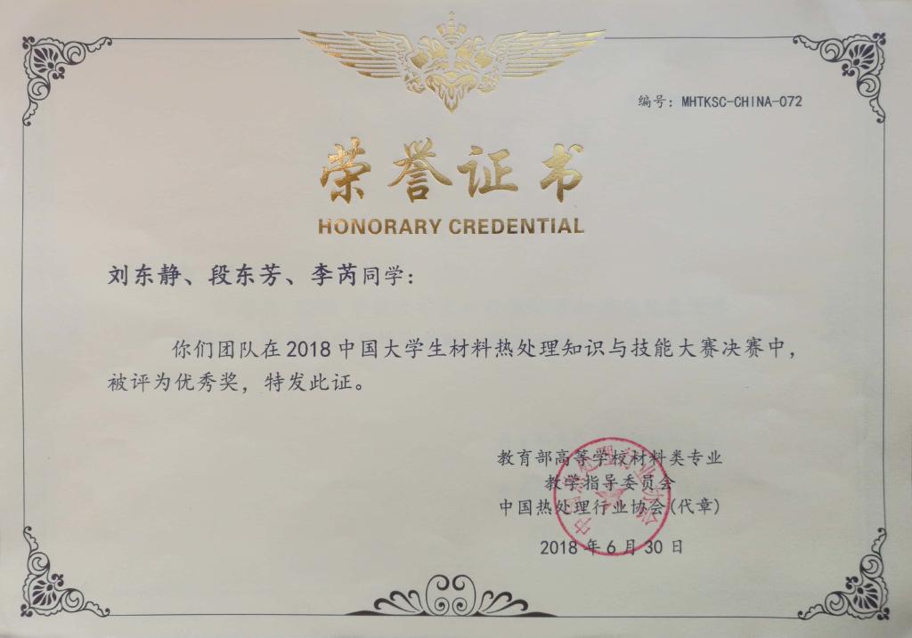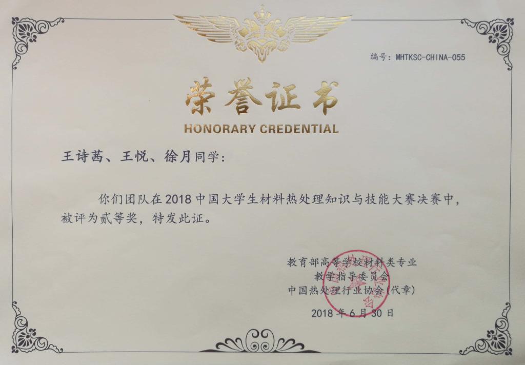 日前,2018中国大学生材料热处理知识与技能大赛落下帷幕。本届大赛由中国热处理行业协会、教育部高等学校材料类专业教学指导委员会主办,中国热处理行业协会教育培训工作委员会、哈尔滨工业大学、河北工业大学、福州大学、西南交通大学共同承办。我校材料科学与工程学院王诗茜、王悦、徐月、刘东静、段东芳和李芮6名学生分成2队参加比赛,分别荣获二等奖和优秀奖,材料化学专业副教授由园博士被评为优秀指导教师。